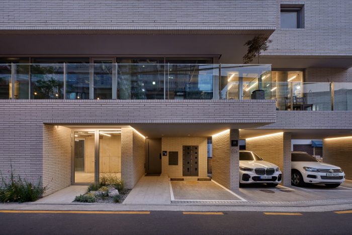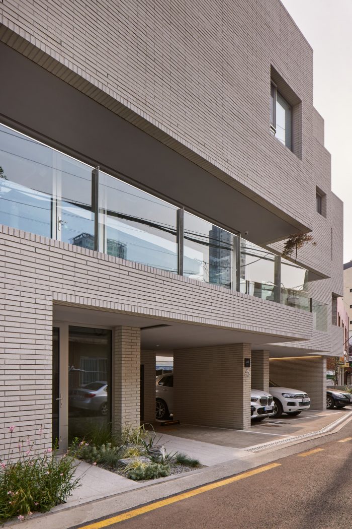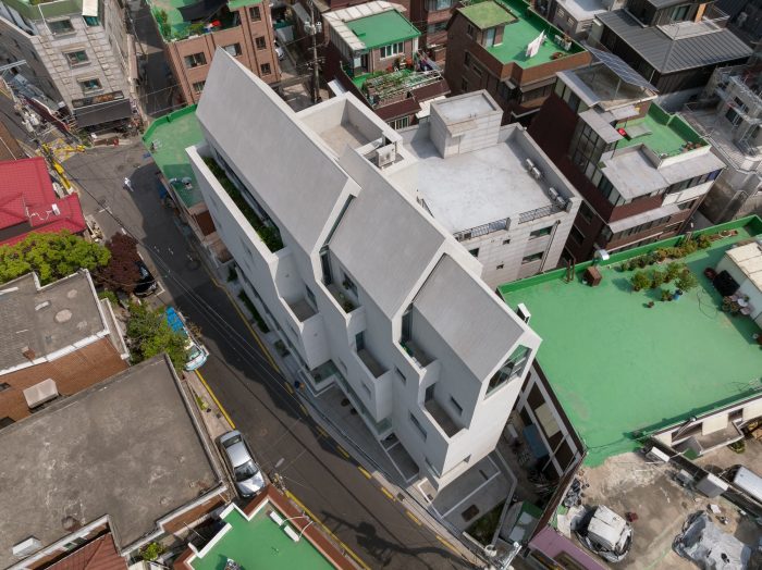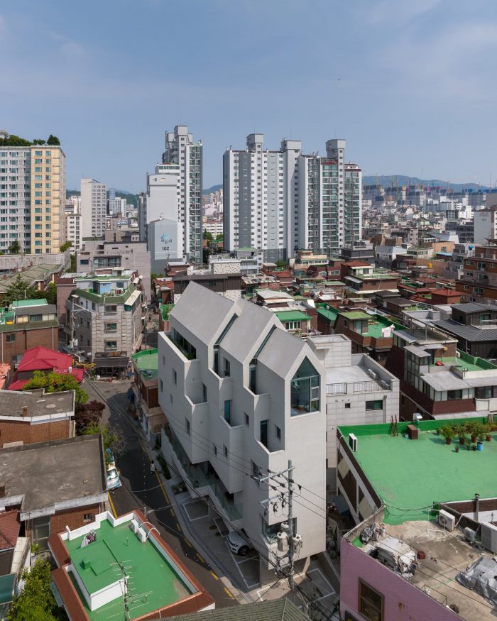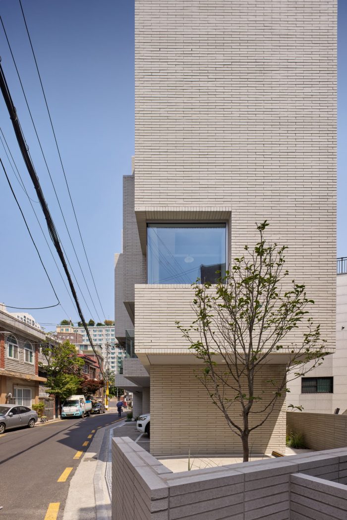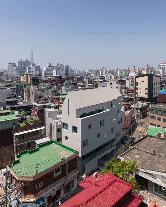 The entire building was planned with a single material of white color concrete block from the roof to the external wall and external space on the 1st floor that connects different programs to one particular image. The white color building is mixed with various forms and materials from a single house to 4-5 story commercial buildings to create an empty space in a city's complex landscape and serve as a background of the alley landscape.