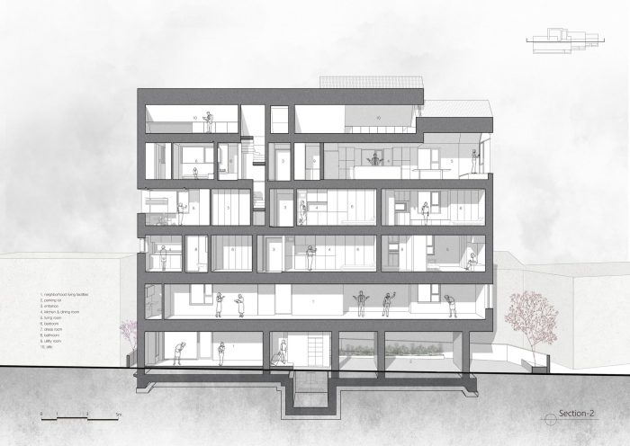后面的一条狭窄的街道与人行道和车行道混合在一起,构成了一个活跃的城市景观,因为道路和生活是紧密相连的。然而,他们的人行环境很差。T-Roof在路边规划了一个小的公共花园,为激活的小巷景观增加了放松的机会。在每一代人的天井处的小花园,从附近有高楼大厦的城市中的公共花园中起到景观的作用。