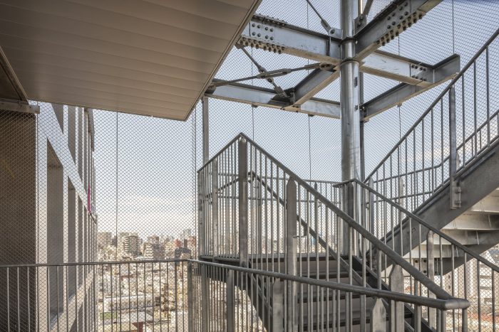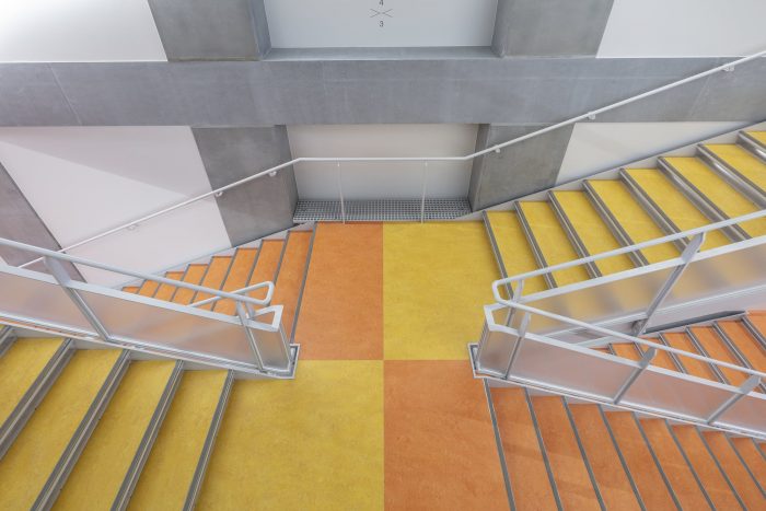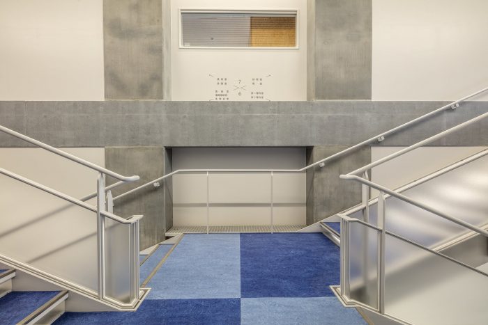 Students enter the school building from the platform on the second floor. Each grade is located on each floor from the third to the fifth floor. The sixth and seventh floors consist of special classrooms. Students mainly take stairs to move around, and in the sense of reinforcing the community and relationship between the upper and lower floors, a gentle sloped X-shaped staircase is planned in the center of the building with two entrances and exits connecting the open space. Stairs are not only a simple passage but also a space of opportunity for meeting and exchange. From the fifth floor, Students can access the playground located on top of the gym.