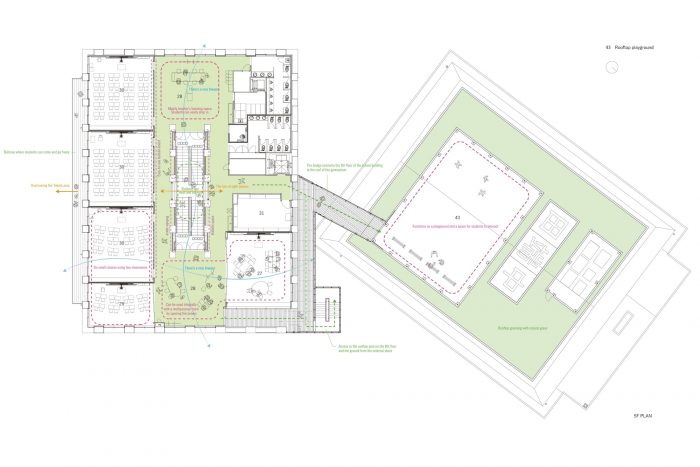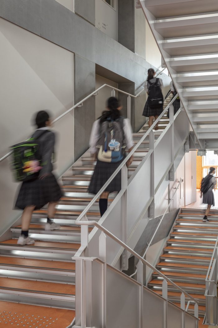 学生从二楼的平台进入教学楼。从三楼到五楼,每个年级的学生都在每个楼层。第六层和第七层由特殊教室组成。学生主要走楼梯活动,从加强社区和上下楼层关系的角度出发,在建筑中心规划了一个缓坡的X形楼梯,有两个出入口连接开放空间。楼梯不仅是一个简单的通道,也是一个提供聚会和交流机会的空间。从五楼,学生可以进入位于体育馆顶部的操场。