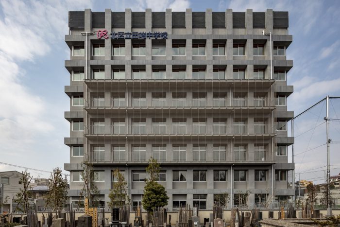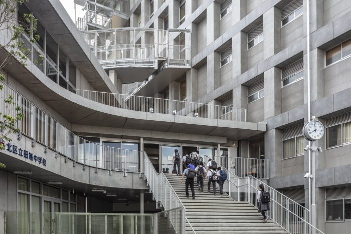 A Compact High-Rise School in Harmony with the Local Landscape. It is the junior high school planned on the site of the former Takinogawa 7th Elementary School as a part of the Kita City school restructuring plan. The site is a district in which the faint atmosphere of a novelist village called Tabata-Bunshimura from the Taisho period to the war period. And the north side with a large retaining wall formed from the topography is a valuable open space in this area adjacent to a temple.