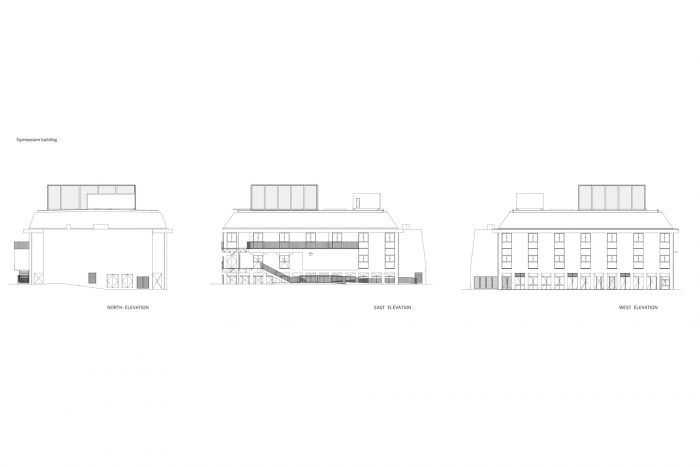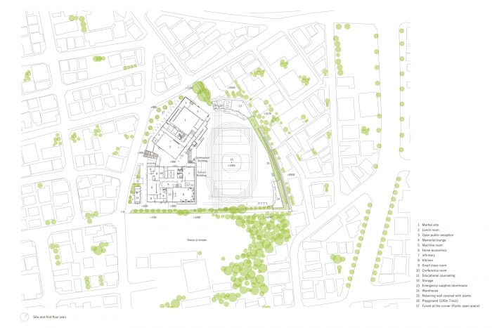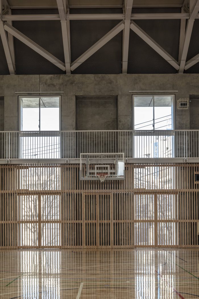 与道路相邻的学校场地向公众开放,与十字路口相邻的部分与街角的森林相连,以创造出时间的外观。在体育馆的第一层,该建筑作为当地的设施向公众开放,在第二层有一个体育馆。也可以只使用体操馆。