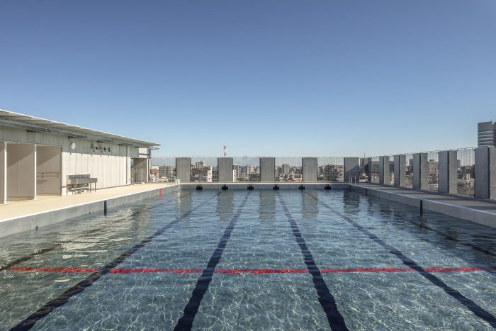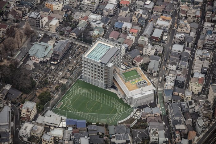 A gymnasium, swimming pool, 12 ordinary classrooms, and disaster prevention base functions were required on a narrow site of about 7,200㎡ surrounded by houses. It was planned as a compact and three-dimensional junior high school consisting of 8 story school building and 2-storey gymnasiums. A swimming pool and playground are located on each building’s rooftop. The ground of the modified artificial turf blends in with adjacent open space and temple: thus, creating a local atmosphere and leaving a memory of the city.