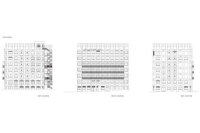 在被房屋包围的约7,200㎡的狭窄场地上,需要建设体育馆、游泳池、12间普通教室和防灾基地等功能。它被规划为一所紧凑的立体初中,由8层的教学楼和2层的体育馆组成。每栋楼的屋顶上都有一个游泳池和操场。改造后的人工草皮的地面与邻近的空地和寺庙融为一体:因此,创造了当地的氛围,并留下了城市的记忆。