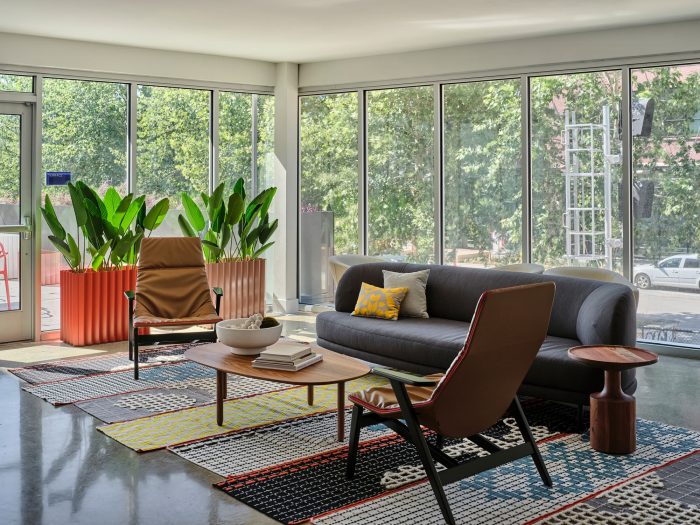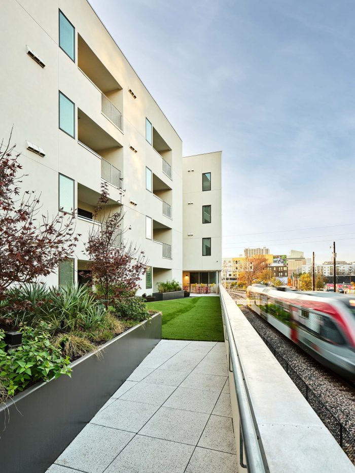 The architect and landscape architect worked seamlessly to create the bermed outdoor community space adjacent to the Capital Metro light rail on the second-floor terrace. The design includes sound buffering and high-quality windows to mitigate noise issues while maximizing daylighting and promoting individual privacy. Additionally, the building’s orientation toward downtown provides sweeping views from both the common spaces and many of the apartments.