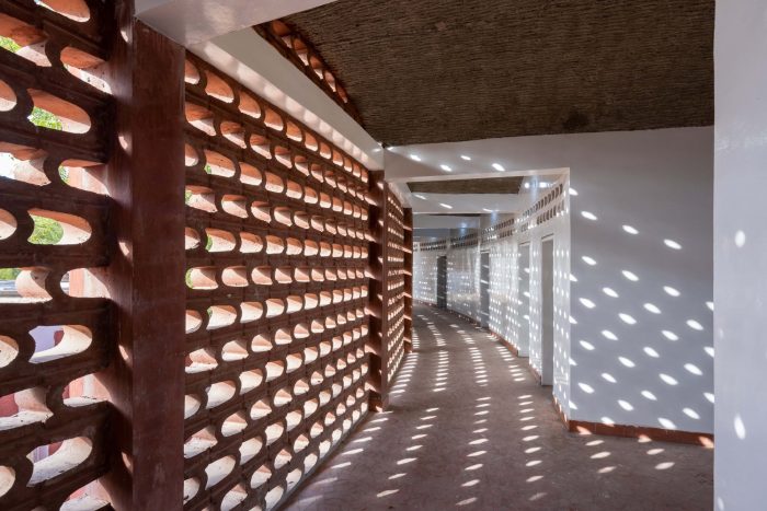 Manuel Herz’s Design. Herz’s design includes several passive climate design innovations to combat the challenges posed by the extremities of the local weather, and to help forgo the need for air conditioning. The building is characterised by a narrow width of only seven metres, a feature which allows for all the rooms to be aired and cooled naturally through cross ventilation. In addition, his mashrabiya-inspired use of lattice-like brickwork with apertures has the advantages of blocking sun and facilitating air circulation, whilst also giving the hospital its distinctive recurrent visual motif and its beautiful play of light and shade. A second roof covers the primary roof of the extension, repelling most of the direct sunlight and creating a chimney effect which draws the heat upwards and out of the rooms below .