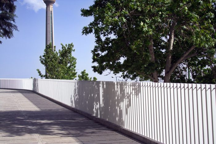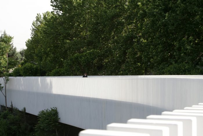 To avoid blocking the view of pedestrians and cyclists to the green valley embedding the motorway and Alborz mountains, 70% of the bridge sides are hollow, and only 30% is closed. This has been materialized by the repetition of U-shaped profiles (every 15 cm), which function as handrails on the sides and cover the structural elements at the bridge's bottom. The U-shaped profiles, furthermore, pave the bridge with dynamic patterns of shadow with hourly and seasonal variations. For the U-shaped profiles to look like suspending objects – one of the principal design ideas – all other parts of the bridge are pained in dark grey. The U-shaped basket itself is painted in white to arouse the feeling of lightness. Rather than the paint, there are no additions to materials, they are pure and explicit.