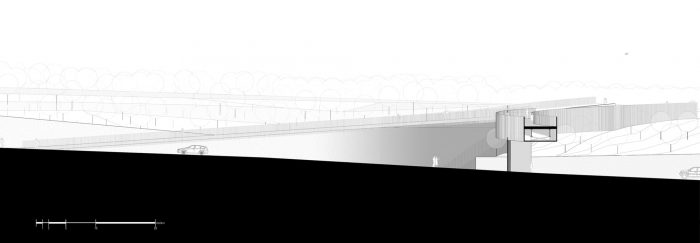 为了避免阻挡行人和骑车人对嵌入高速公路和阿尔博尔茨山脉的绿色山谷的视线,70%的桥面是空心的,只有30%是封闭的。这一点通过重复使用U形型材(每15厘米)来实现,U形型材在侧面起着扶手的作用,并覆盖了桥底的结构件。此外,U形型材还为桥面铺设了动态的阴影图案,每小时和季节性的变化。为了使U形型材看起来像悬挂的物体--这是主要的设计理念之一--桥梁的所有其他部分都被涂成了深灰色。U形篮子本身被涂成白色,以唤起轻盈的感觉。除了油漆之外,没有添加任何材料,它们都是纯粹而明确的。