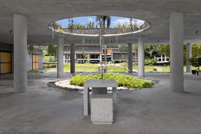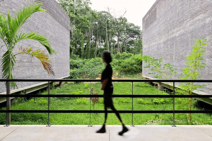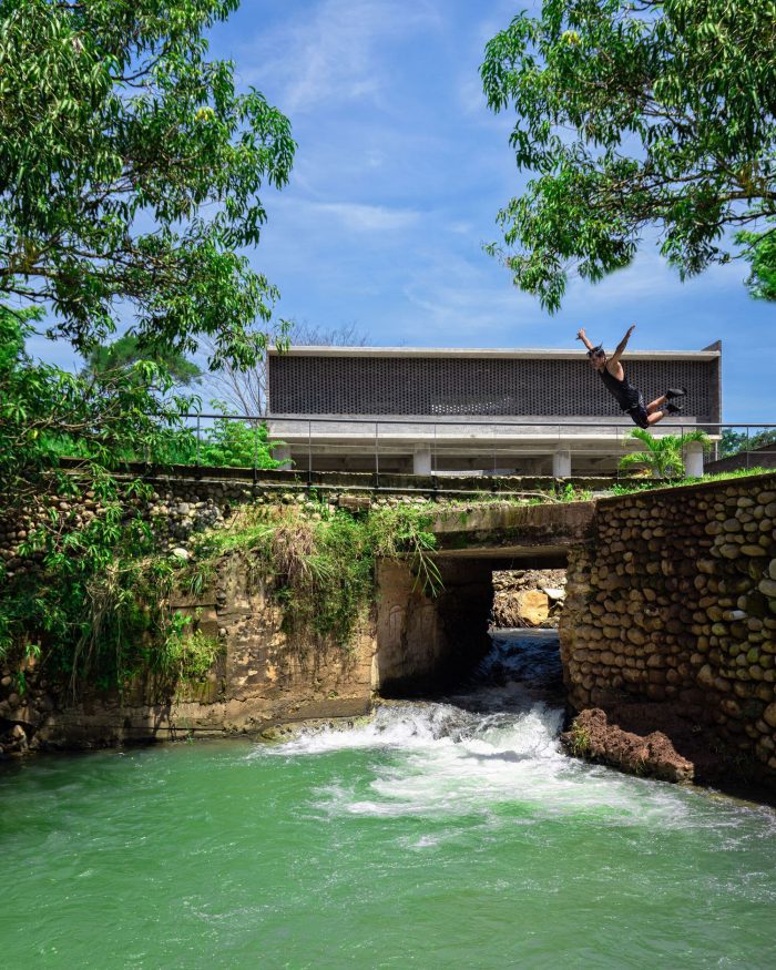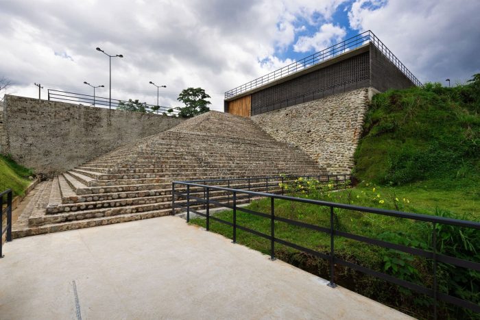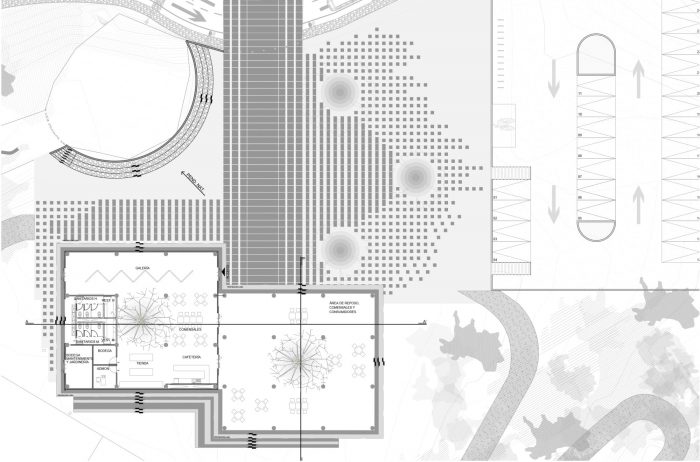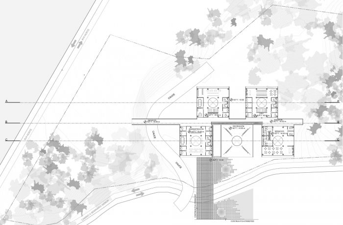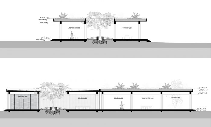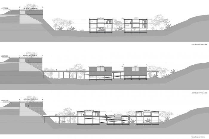 The main entrance to the CDC is located in front of the Avenida 8va Norte avenue. The outdoor forum can be reached from the access courtyard, next to which there are some stairs that allow access to the terrace of the Community Support module, favoring the comfort of the users and the organization of outdoor cultural activities. All the modules, with the exception of the community support area, are located on the north terrace of the property at a lower elevation than the access and are supported on stilts. This allows the infiltration of rainwater and the use of the ground with areas sheltered from the sun and rain. Access to the modules is through an elevated central corridor, which favors far-reaching views and the observation of nature from a better position.