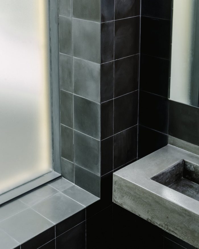 As a practice, we are focused on sourcing whatever we can locally, upcycling materials where possible, and celebrating the local architectural heritage. We are also committed to material experimentation, in this instance for example we knew we wanted cement as the finish for the bathrooms since we felt like it complimented the existing raw material palette, but we wanted to see how the same material could have opposing surface qualities, so we experimented with rough sprayed-on mortar cement for the ceiling and smooth hand-cast cement tiles on the floors and walls, the sinks were cast on-site in custom made molds built-to-size using a cement impregnated with fiberglass fibers and various bonding agents, all 3 material variations were pigmented the same color to accentuate their difference.