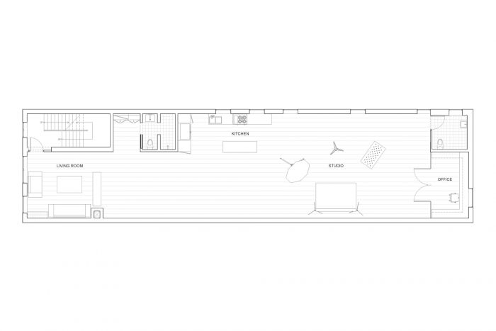 We were approached by a photographer to design & build their new studio in a Brooklyn loft that they had just acquired. The program called for a flexible space that could accommodate a variety of different studio setups. Formerly a residence, the space was subdivided into multiple smaller rooms. Given the abundance of natural daylight from windows on 3 sides of the property and 2 boarded-over skylights, we were able to see the potential of the space if it were to be opened up with as few permanent divisions as possible.