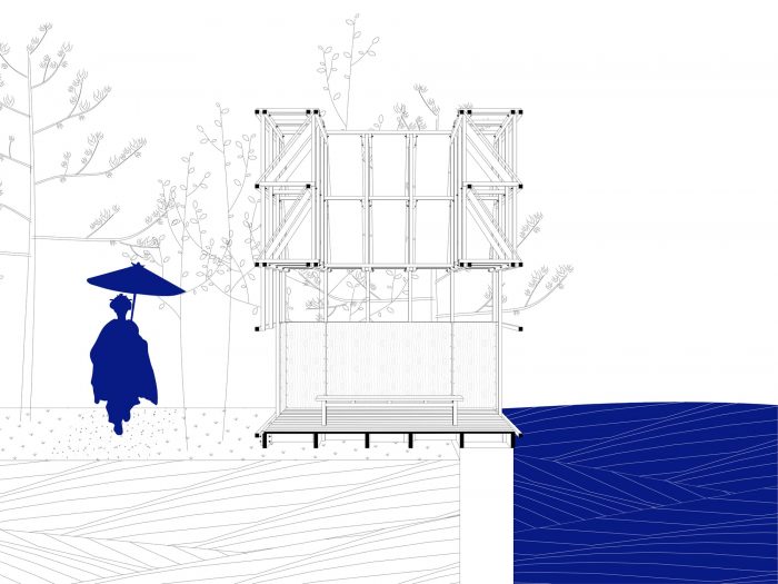 The pavilion has a multifunctional character and, in addition to the tea ceremony, it can also function as a pleasant summer pavilion with soothing views of nature. The square-shaped floor plan refers to simplicity, and the use of primary elements depicts the symbol of matter and man.