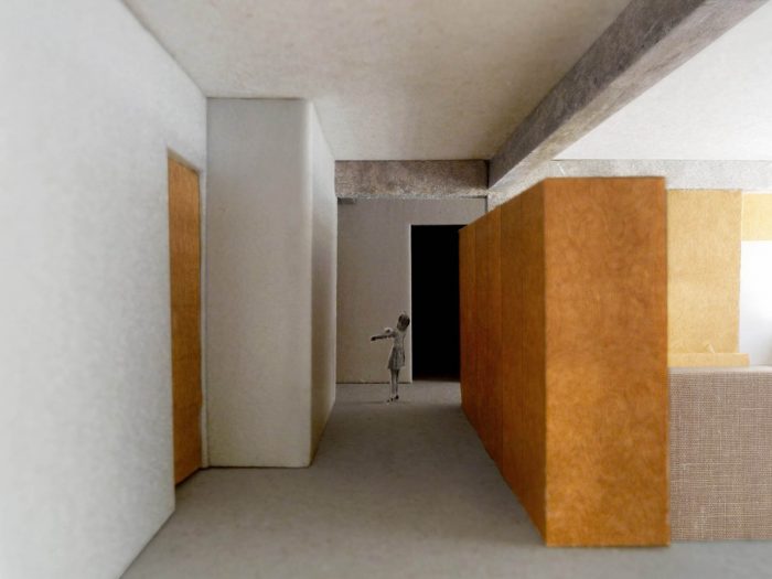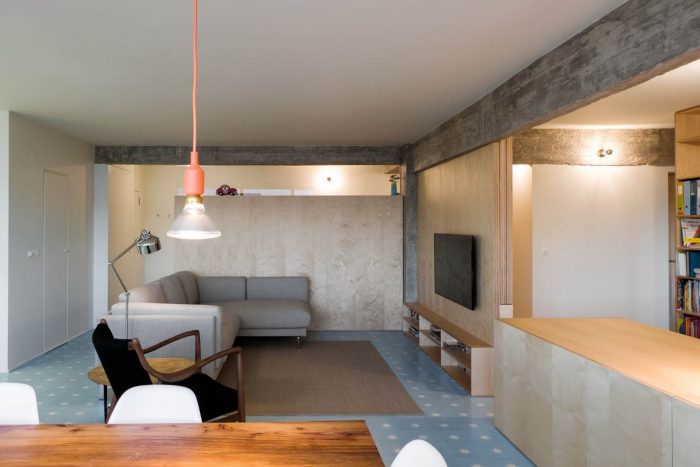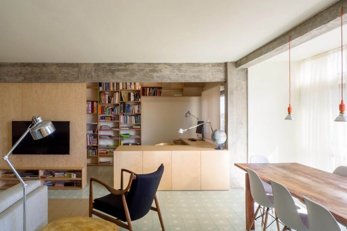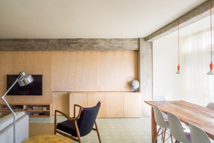 The intervention seeks to reduce the usual sectioning between kitchen, hall, corridors and living room, creating a fluid space with large visual fields and richer possibilities of appropriation. The bedrooms maintain a private character and the toilets are redrawn so as to break the feeling of claustrophobia. Protruding structural elements of beams and pillars will have its concrete re-exposed, without shame, and together with the new wooden elements, will contribute to the new atmosphere of the apartment, reigniting the qualities and pleasure of living in an apartment, in a city.