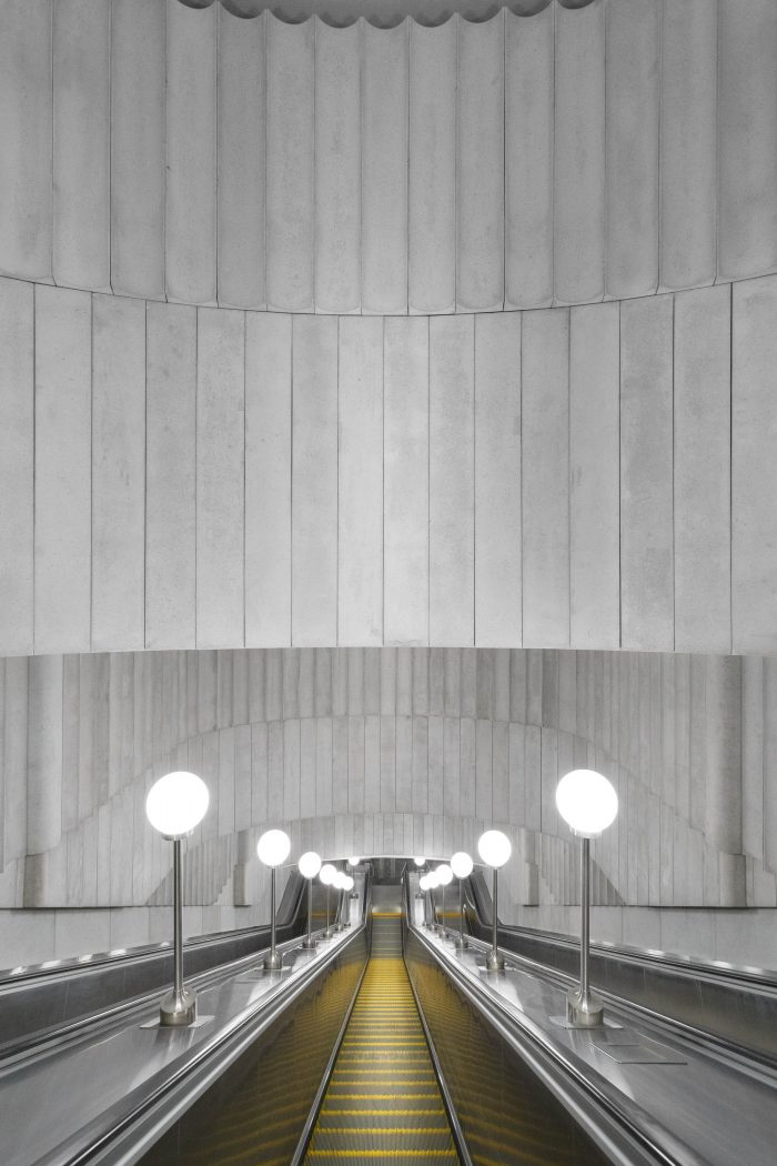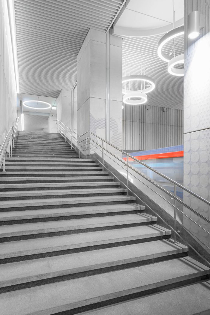 The entrance pavilions are designed as high portals, visible from afar with their 16-meter portals. The reflected light of the well-known bright red letter "M" illuminates the portal, marking the entrance to the brave new world of the Moscow Metro's Big Circle Line.