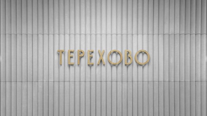 The design of the Terekhovo station is reminiscent of the historic interiors of the Moscow metro. It has many classic details: flutes, caissons, colonnades in a modern minimalist interpretation. Abstract silhouettes of ordinary people are printed on columns like the heroes of the metro of the past: workers, farmers, and scientists.