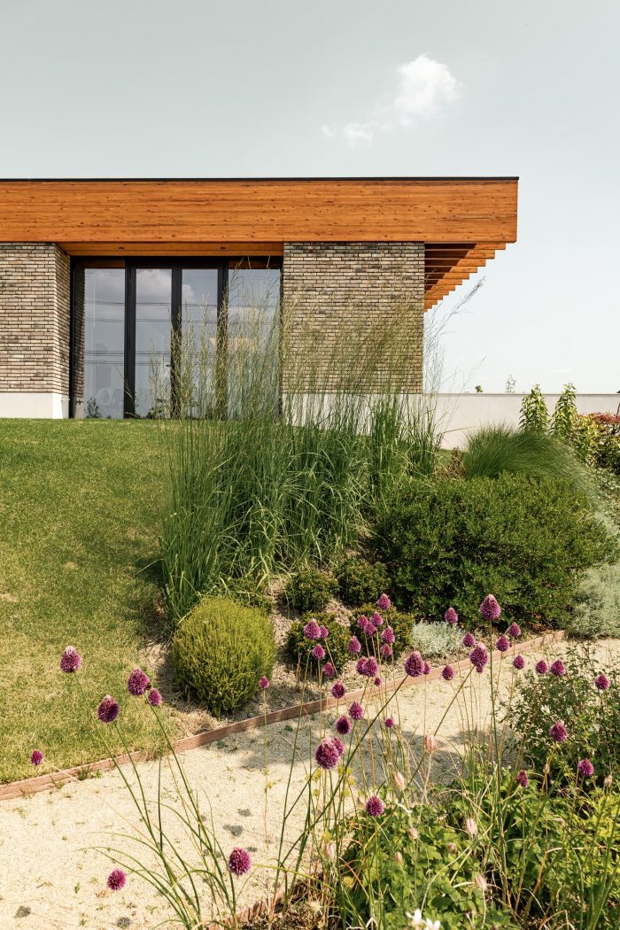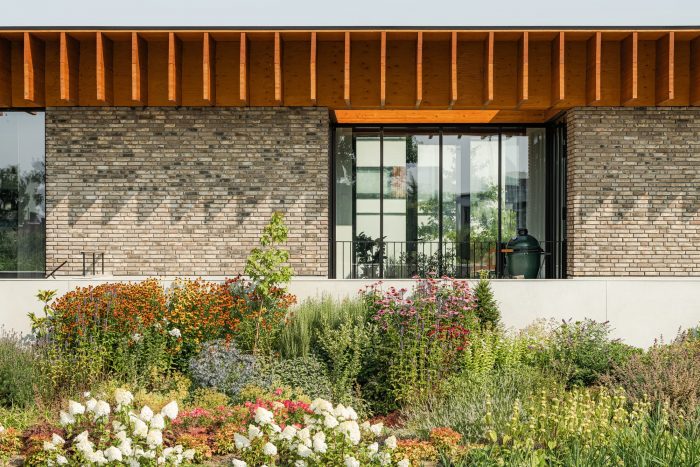 The pronounced wooden beam structure is continuous from the interior to the exterior and forms a canopy on the south facade. As a result, the boundary between the living room, veranda, outdoor rooms, and patio becomes indistinct and the landscape flows into the house.