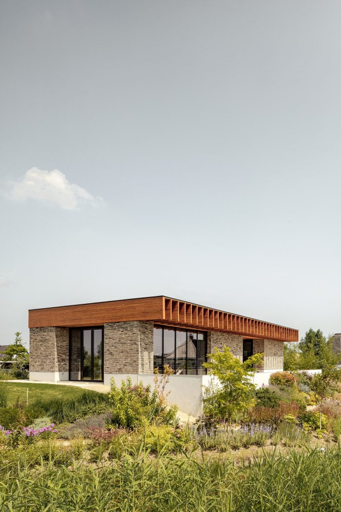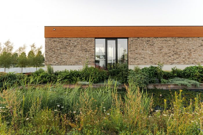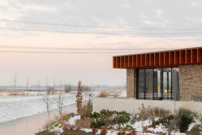In the open polder landscape of dikes and small islands near Rotterdam, the Terphouse is situated as a sturdy structure on a mound in the landscape. The means used to make the house sustainable and ready for more extreme climate conditions became the main elements of the design, most apparent in the characteristic canopy and underground level with the protruding patios.