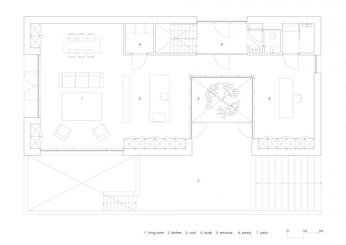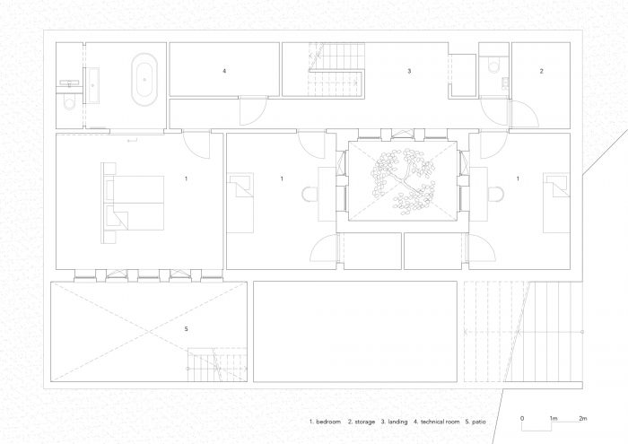The climate in the lowest level is moderated by the surrounding soil, while the protruding patios provide for sufficient daylight and an intimate atmosphere. On the top level, the patio structures the sequence of spaces and provides visual relationships between the rooms.