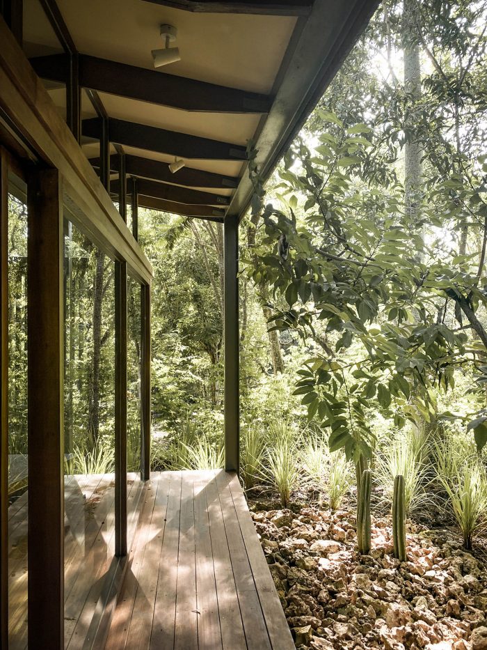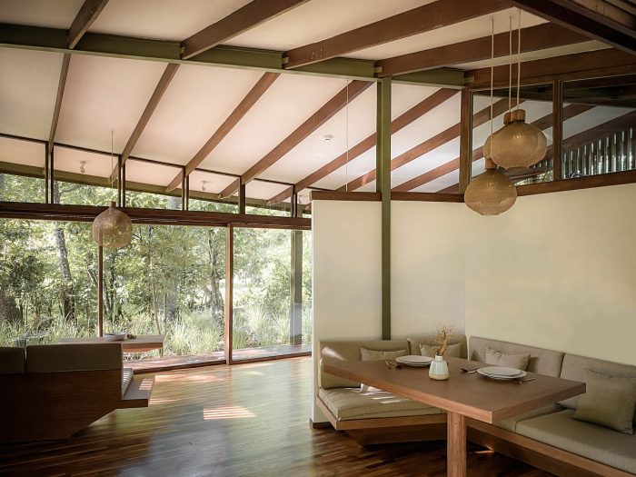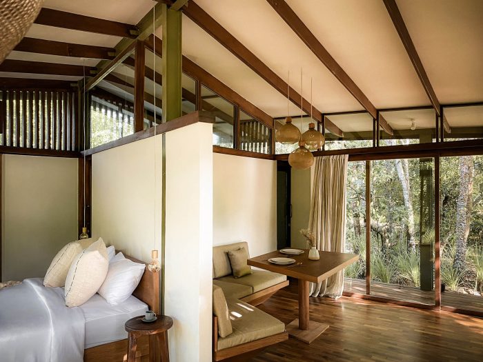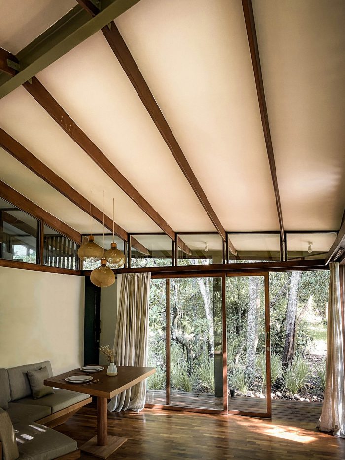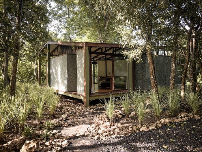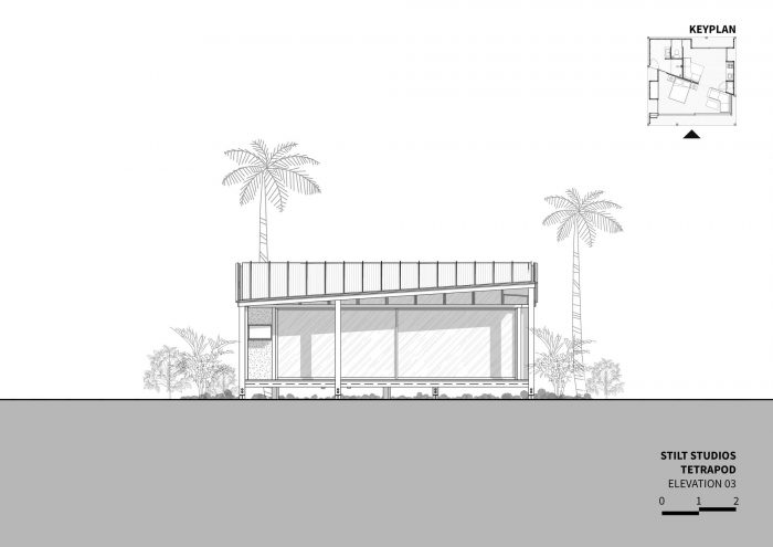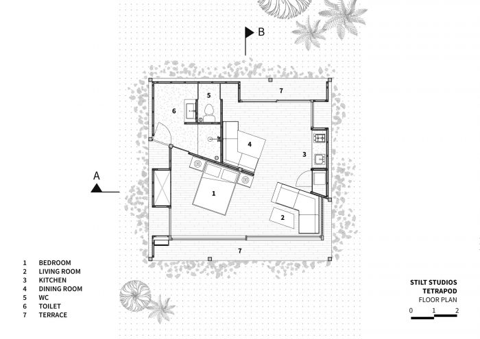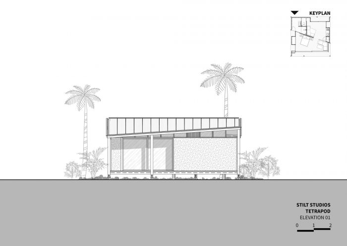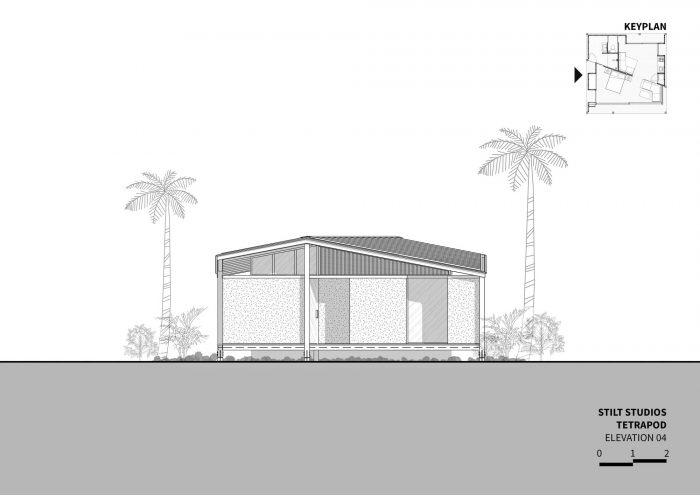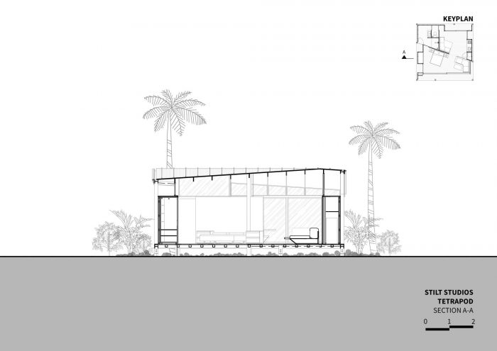 The contemporary design of the sloping roof channels rainwater through the designed structural system which is then stored for further use like watering the surrounding garden. Through openings that are closely put under the canopy, the building seeks to empower passive cooling. In only 64m2 you will find a comfortable bedroom, en-suite bathroom, open kitchen, and living room as well as some outdoor terraces. Nine point foundations lift the Tetra Pod 40cm above the ground, offering a perfect sitting height on the porch. The large façade panels can be opened to provide a cross-ventilation, making the space completely open. Layers of curtains make the house more private. It also introduces a customized furniture system for a cozy dining and living space.