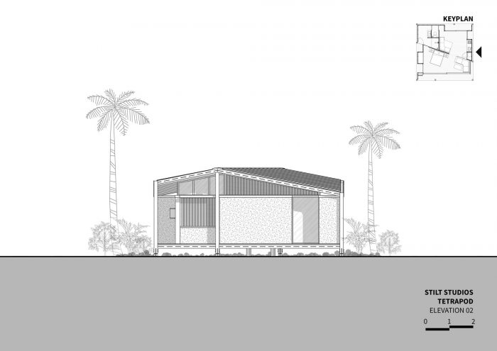 Stilt Studios is happy to be able to present the first finalized Tetra Pod Studio in Uluwatu, Bali. A prefabricated tiny house using recycled Tetra Pack Cartons as wall and roof material, bringing together unique design while playing a part in the local, circular economy. The Tetra Pod is a 64sqm home with all living amenities elevated 40cm off the ground, built from wood, steel, glass and recycled materials. The architecture seeks to blend into its surroundings by making use of the recycled materials' reflective characteristics, while strategically placed openings carefully frame view corridors. The diagonally oriented floor plan creates exciting spaces that exude outward into the exterior. The balanced compromise of open facades and the use of space make this small home elegant and spacious.