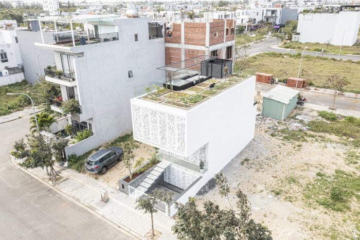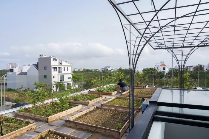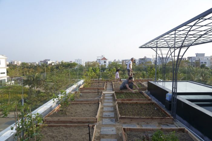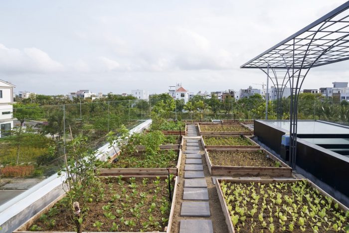 To solve the second problem: We use the entire roof for growing organic vegetables, spices, and small fruit trees. In addition, the vegetable garden also has an excellent effect in preventing heat for the lower floors and preventing concrete breakage due to day and night temperature changes and sudden weather changes.