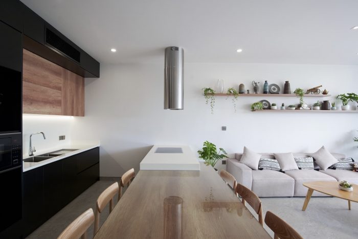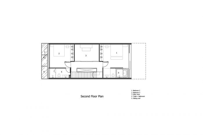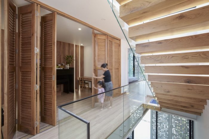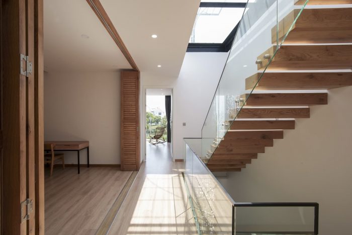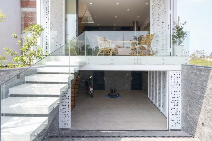 To deal with the first problem, instead of building a high-rise, we use a semi-basement design to optimize the usable area without increasing the overall height. This design can also reduce commuting within the house but maintain space for arranging functional areas. We place a garage, technical, and storage room in the basement. On the first floor, there is a common space that includes a kitchen, shared toilet, and guest bedroom. Although the length of the land is relatively short, using many skylights and automatic doors to get light, bedrooms and bathrooms are always airy and comfortable. On the second floor, there are two bedrooms, one in the front and the other in the back. In between these two bedrooms is the worship space. Along with that is a large skylight for getting light into the hallway and stairs; it helps convene the air better.
