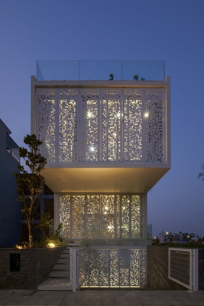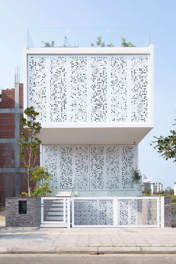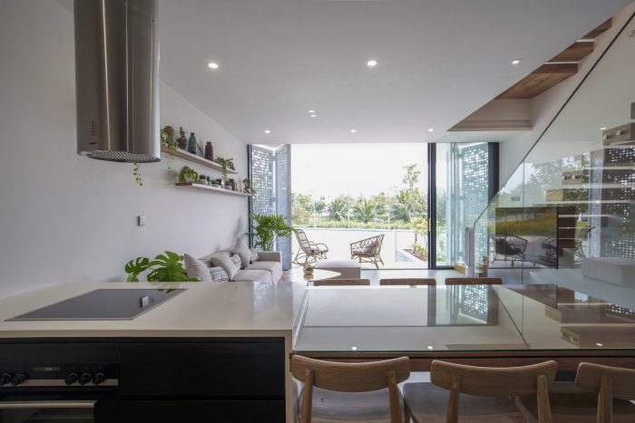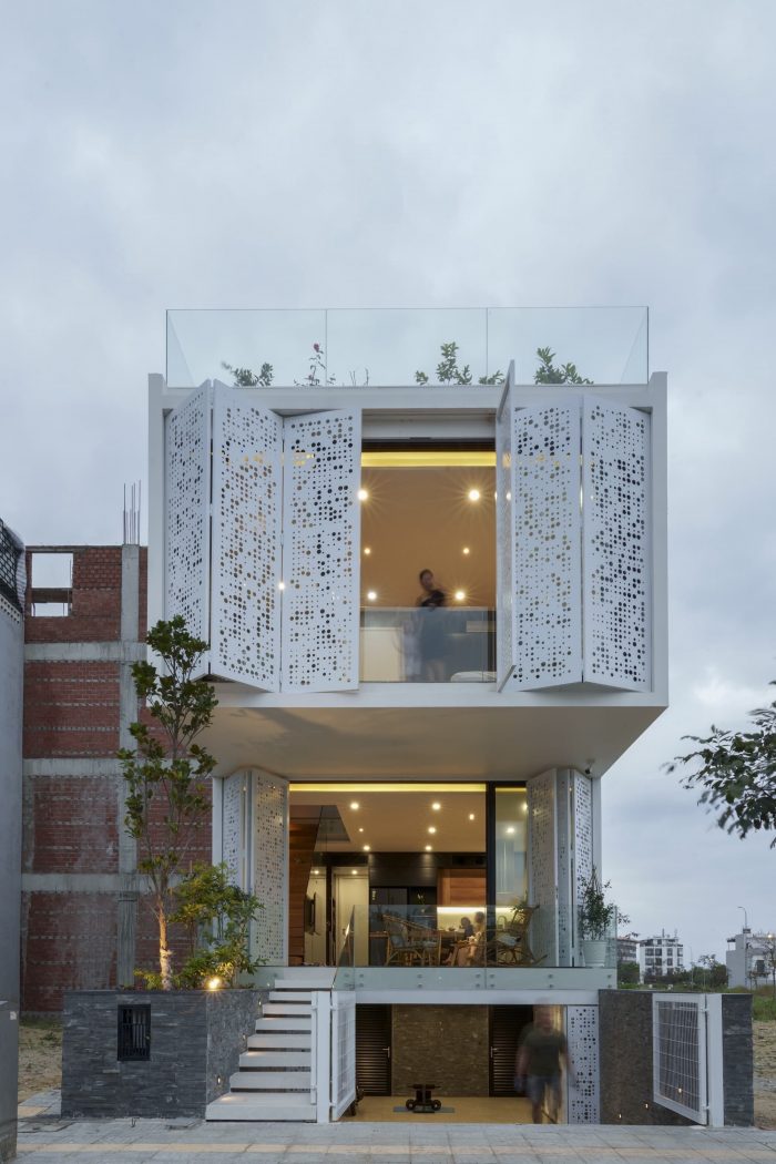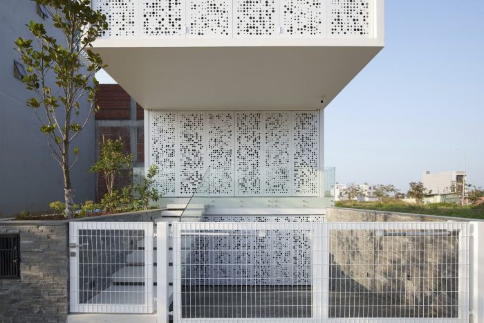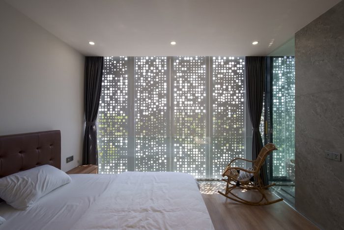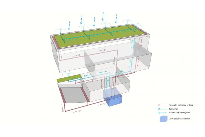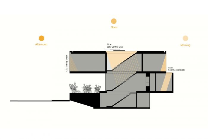 To solve the 3rd problem, in terms of energy: We have calculated to make optimal use of natural solar and wind energy. Limit solar radiation by perforated steel bar systems so that the wind can pass through, from which fresh air is continuously circulated. In addition, sunroof systems with sensors and automatic control systems are used to get more light and wind for all bedrooms and bathrooms. In terms of water resources: We designed a water-recycling system. Rain and daily watering plants will be collected into a large underground storage tank and can be reused again. It helps to save a part of the use of scarce water resources.