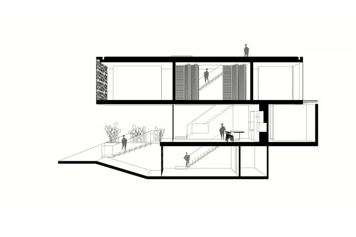 为了解决第一个问题,我们不建造高层建筑,而是采用半地下室的设计,在不增加整体高度的情况下优化可用面积。这种设计也可以减少房屋内的通勤,但保持安排功能区的空间。我们在地下室放置了车库、技术和储藏室。在一楼,有一个公共空间,包括厨房、共用厕所和客卧。虽然土地的长度相对较短,但利用许多天窗和自动门来获得光线,卧室和浴室总是通风和舒适。在二楼,有两间卧室,一间在前面,另一间在后面。在这两间卧室之间是礼拜空间。随之而来的是一个大的天窗,用于让光线进入走廊和楼梯;它有助于更好地召集空气。