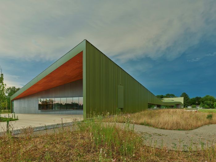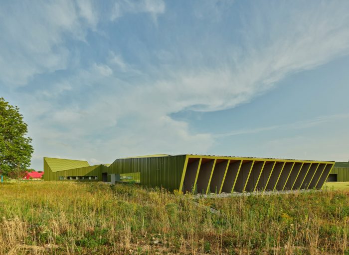 Bike Barn (May 2020). Sited on a berm on the eastern edge of the campus next to the soccer field, the cyclo-cross, and the pump track, the Bike Barn is integrated into a network of pedestrian pathways that connect Thaden School to a larger system of trails that extend throughout northwest Arkansas. By reconfiguring the profile of an Ozark gambrel barn to maximize the height below the trusses, a variety of sports can be accommodated, including volleyball, basketball, and cycling, while also providing bike storage and support facilities. A local manufacturer fabricated the trusses, which were developed collaboratively using local materials and expertise. The exterior walls are clad in locally sourced cypress and finished with a combination of red paint traditionally used on barns or a clear finish that protects the wood. On the west side, a deep porch faces the soccer field and provides shelter and shade for spectators. Except for storage and locker rooms, the entire space is naturally ventilated through a mix of open joints in the cypress board siding, vented skylights, and a series of roller doors that open to the surrounding landscape.