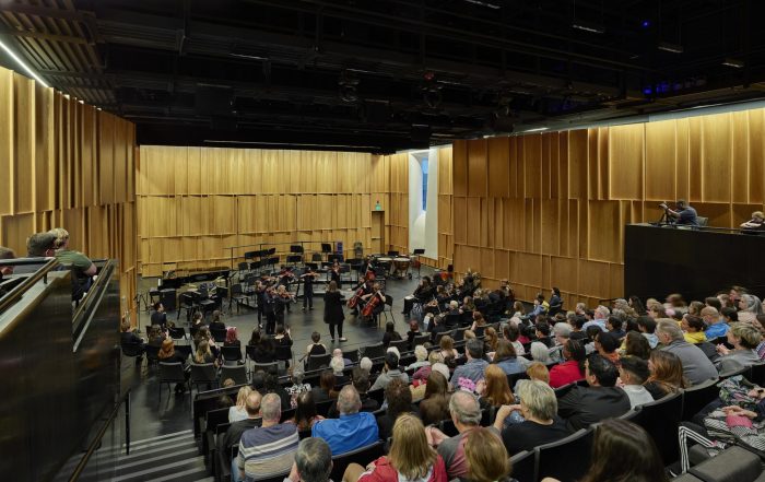 Performance (November 2021). As envisioned in the campus master plan, Performance is situated on the northwest corner of the main campus and, by virtue of its location, is highly visible to the public and serves as an inviting hub for community connection while maintaining campus security. The building supports a wide variety of educational programs in the performing arts, including music, drama, and film, all with ready access to a world-class performance venue. The versatile and efficient allocation of space advances the school’s mission and identity as a stage for improvisation, experimentation, and imagination. A generous loggia and expressive canopy create a strong and welcoming street edge. They extend well beyond the main body of the building and lead to a skylit entryway. Other than the glazing on each side revealed when the multicolored metal shell lifts, only one large window in the 3 performance halls punctuates the exterior shell. Looking out to the campus and the original Thaden House, this monumental window is even larger on the interior, which brings soft, indirect light into an otherwise sealed performance hall. With direct connections from the stage to the back of the house, the performance hall is a versatile and professional venue for creative performance.
