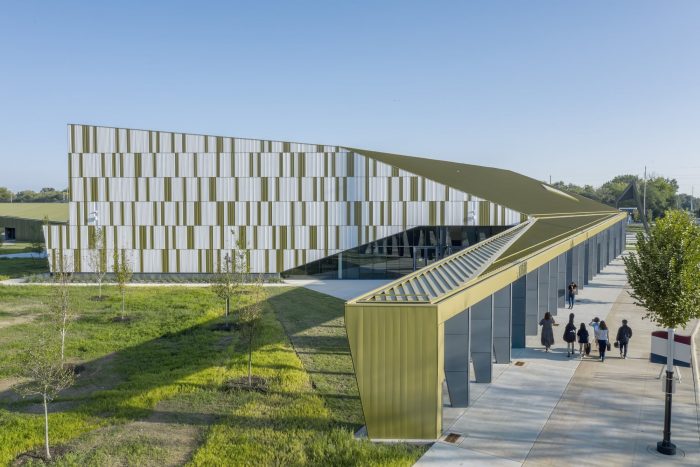 Wheels Science and Fabrication Building (August 2020). Home to the signature Wheels program, the Science and Fabrication Building creates a public presence for the school by linking the campus to Bentonville Square. Situated west of the 2 student commons and south of the Thaden Performance building, the building opens to the east to create a sense of entrance and arrival. A canopy along Main Street acts as a “billboard” for the campus and creates an outdoor workspace for the Wheels lab. Similar to the Arts and Administration Building, the Wheels building roof is a performative response as much as it is a figural expression.