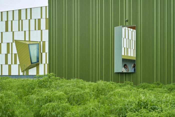 Reels Arts and Administration Building (August 2019). The new Art and Administration Building houses the signature Thaden School program, Reels, and includes classrooms, wet labs, and administrative spaces. Designed to respond to the environmental challenges of water collection and daylighting, the undulating roof also frames entries and connects various landscapes. Visible from almost everywhere on campus, the distinctive roof pitches and rolls provide daylight and ventilation. Sited on the northeast corner of the campus, a large entry porch leads to the campus center, the Thaden Performance building, and a courtyard shared with Thaden House.