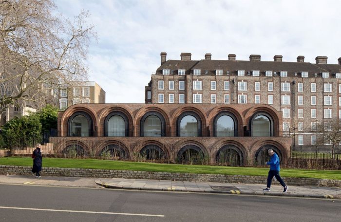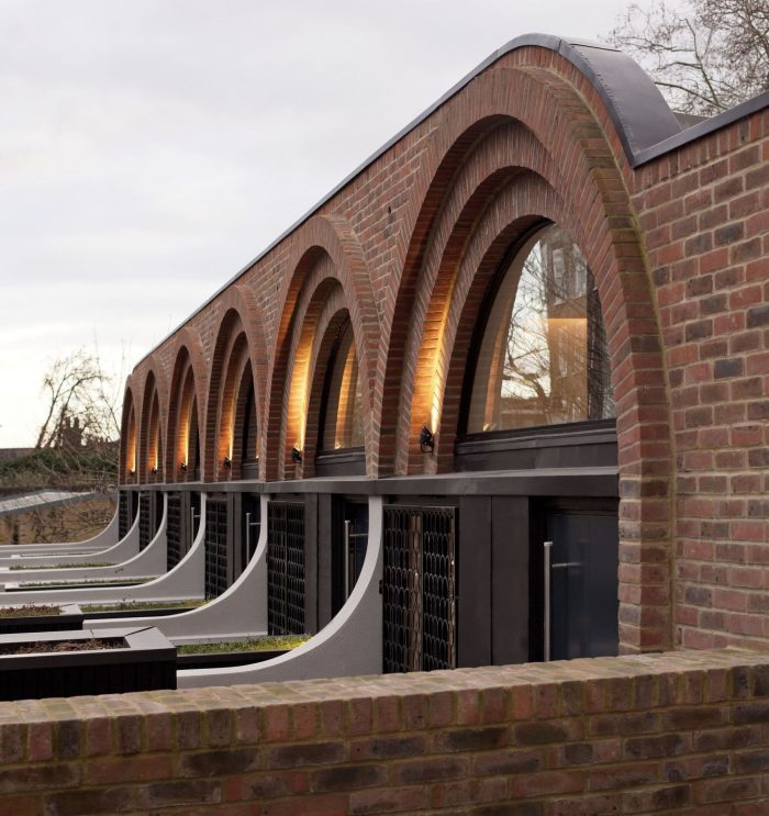 The Construction & Sustainability. The Old Petrol station that has been on that site since the 1950s was marked by the council as negative contributor to the local conservation area, with its large forecourt and oversized canopy blocking long views through and across the site. Cleaning up the contaminated site became a valuable benefit of this project. The first port of call was to completely remove the old 1950s petrol tanks safely, removing any contaminated earth then covering this over with new open safe green public space. We used as much timber framed construction as possible. The Planners requested that we dig down into the ground to create a subterranean structure, so the retaining walls are all reinforced concrete, but inside this sits a lightweight prefabricated timber structure was constructed off site then assembled in days. light weight steel cross bracing holds the giant arches in place. A green roof was installed to harvest rainwater and photovoltaics are installed on the roof to add renewable power to the homes. We sourced an Ibstock Bexhill Red Multi brick for the facade work and explored brick bonding patterns to differentiate the different areas of the building and give order to each facade. The Arches themselves were cast in concrete off site under controlled factory conditions rather than traditional arches made from wet construction. These concrete arches were then clad with brick slips. The Dwellings / Layout. Each house is around 130sqm2 with 3/4 bedrooms and a study and garden room. The proposed dwellings have a similar layout, with entrances to the units from College Lane. As the land slopes, the entrance to the units is either flush with pathway or accessed via a stepped entrance. All properties benefit from a front garden that incorporates a private bin storage area, entranceway and lightwell to illuminate the rooms that face onto College Lane at lower ground floor level. The lower ground level provides a further two bedrooms, two bathrooms and a lightwell to the College Lane facade. The basement level comprises an open plan living / kitchen space and opens out onto the sunken rear garden that looks onto Highgate Road and the newly created grassed area. Because of the stepped nature of the site, this lower level does not feel like a basement and the living spaces enjoy a secluded feel with plenty of access to natural light despite sitting close to the main road.