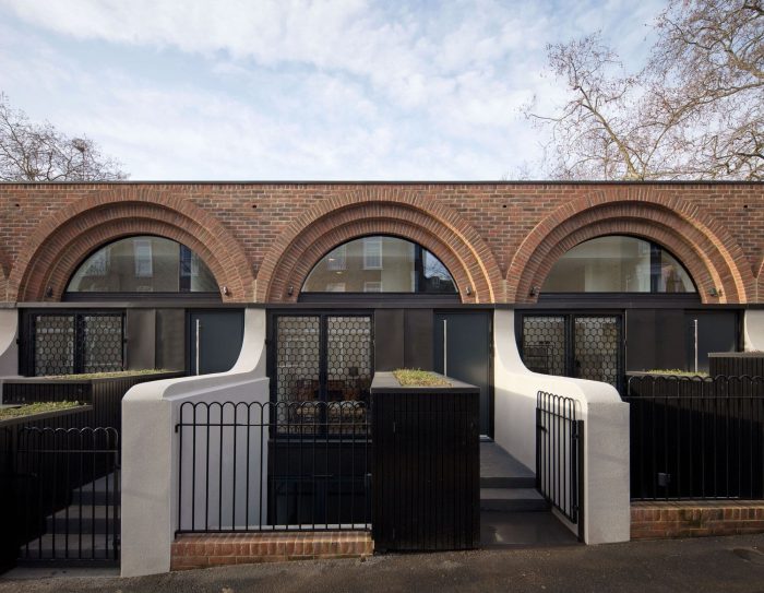 The Architecture. The new architecture itself was a careful response to the comments of the Local Design Review Panel, (A panel of local academics, planners, architects, designers). With David growing up in the area and Daniel having lived nearby, the design was developed firstly on instinct. We felt it was appropriate to have a small mass at the rear, using local London stock brick formed in arches to reference the local colours and the railway arches that sit directly to the site. Many railway arches / tunnels / bridges crisscross the site and it just felt right to reference this important infrastructure. At University we explored the notion of the complete rejection of context to focus solely on explorative architecture, but in this project, we feel that we did both - the context made for a radical exploration of the architecture. We undertook a study of local buildings in and around the local area. All these buildings show, in various forms, the evolution of Neo-Classical British Architecture, emulating the classical Venetian Pallazzo's, Palladian and Inigo Jones’ architectural language. These buildings highlight a strong mixture of rectangles and arches set within a brick canvas that are common within the Dartmouth Park Conservation Area. Of particular interest is the Roman arches and the use of a rendered rusticated base on the ground floor. Key Principles from this historic grain led us to refining the existing design properties in the area to its purest forms, the rectangle and arch - key ingredients of the design process. The new houses are positioned only marginally higher than the original petrol station, and this allows light to reach the ground floor windows of neighbouring Denyer House behind. A green roof covers all of the houses so that the residents high up behind look down on to wildflowers and greenery creating a habitat for various birds and insects/wildlife. During the public consultation in the planning stages of the project, Interestingly, one of the main comments back from the consultation was that the abandoned graffiti looking petrol station of the current site attracts anti-social behaviours and that the residents would welcome life to that empty sometimes dangerous part of College Lane when at night, now completed we hope the new homes will bring life to this part of the College Lane.