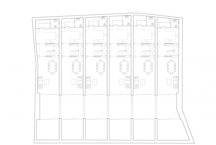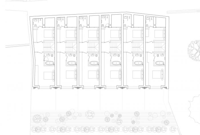 建设和可持续性。自20世纪50年代以来,旧的加油站一直在该地块上,被理事会标记为当地保护区的负面因素,其巨大的前院和超大的顶棚阻挡了通过和穿过该地块的远景。清理被污染的场地成为这个项目的一个重要好处。首先要做的是安全地彻底清除50年代的旧汽油罐,清除任何被污染的土壤,然后用新的开放安全的绿色公共空间覆盖。我们尽可能多地使用木制框架结构。规划者要求我们向地下挖掘,创造一个地下结构,所以挡土墙都是钢筋混凝土的,但里面是轻质的预制木结构,是在现场外建造的,然后在几天内组装起来。安装了一个绿色屋顶来收集雨水,并在屋顶上安装了光伏发电,以增加住宅的可再生电力。我们为外墙工程采购了Ibstock Bexhill红色多孔砖,并探索了砖的粘合模式,以区分建筑的不同区域,使每个外墙都有秩序。拱门本身是在受控的工厂条件下现场浇筑的混凝土,而不是传统的湿法施工的拱门。这些混凝土拱门然后用砖片包覆。住宅/布局。每栋房子的面积约为130平方米,有3/4个卧室,一个书房和花园房间。拟建的住宅有类似的布局,单元的入口在学院路。由于土地倾斜,单元的入口要么与小路平齐,要么通过一个阶梯式的入口进入。所有的房产都受益于一个前花园,其中包括一个私人垃圾储存区、入口和采光井,以照亮地面低层面向学院路的房间。底层又提供了两间卧室、两间浴室和一个面向学院路的采光井。地下一层包括一个开放式的客厅/厨房空间,并向下沉的后花园开放,可以看到海格特路和新创造的草地。由于场地的阶梯性质,这个低层并不像地下室,生活空间享有隐蔽的感觉,尽管靠近主干道,但有充足的自然光线。