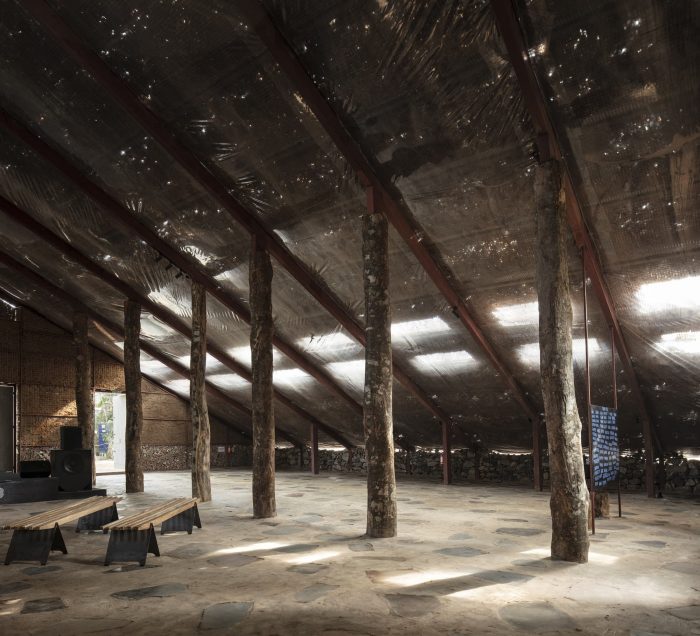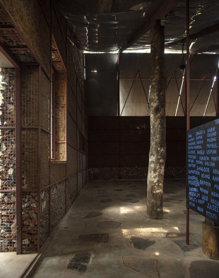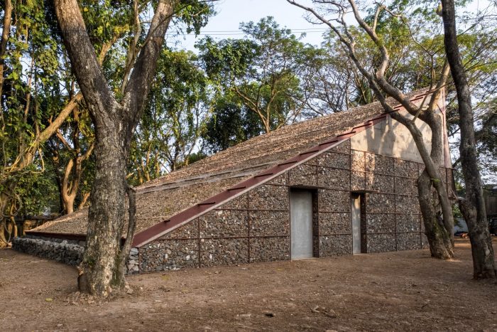 The building unfolds as a large space under a singular roof that touches the ground, inspired by the many roofs of Kochi.