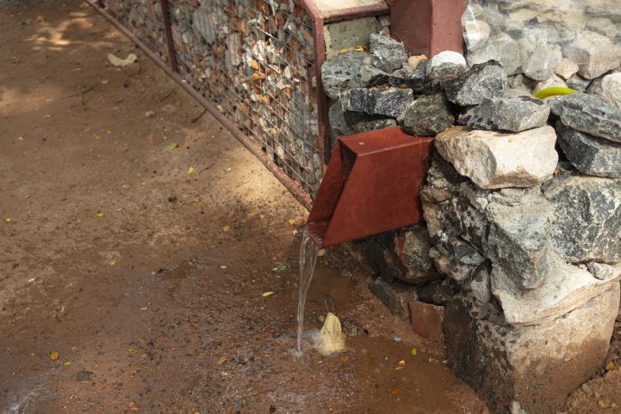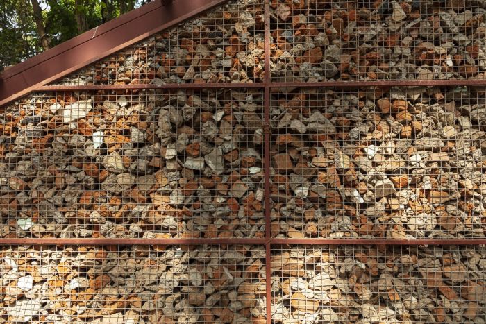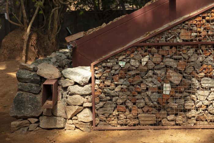 Materials: Construction debris from nearby sites, Waste granite from mines, Coir, Fishing nets, Geogrid, Brick bat, Cement, Wire mesh