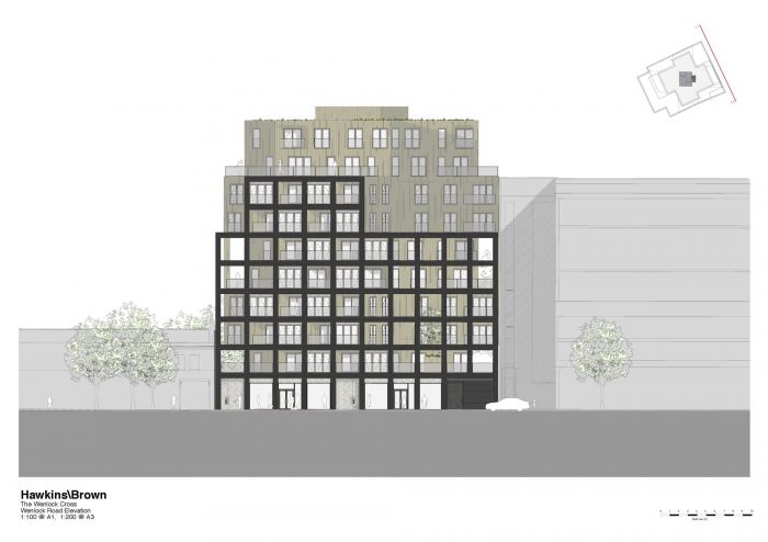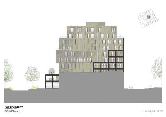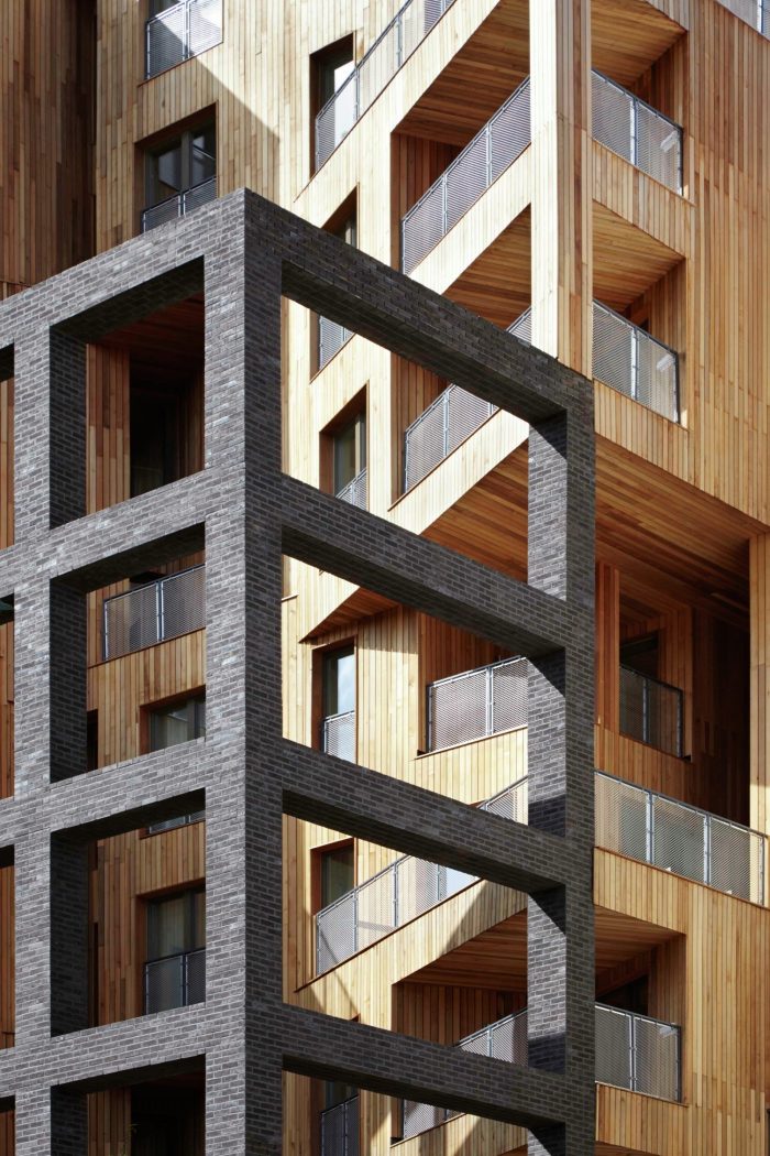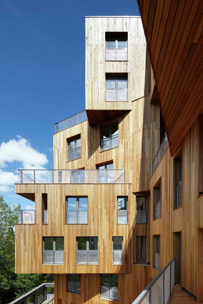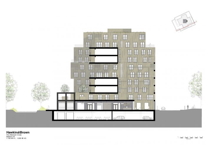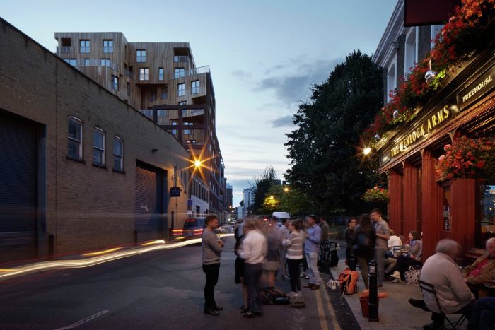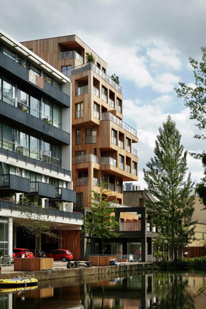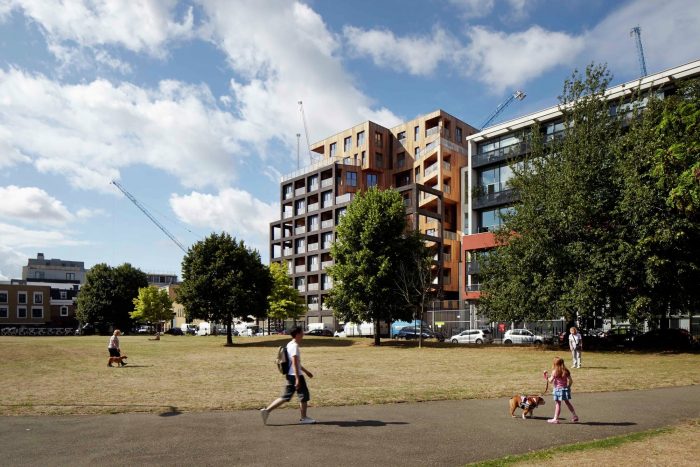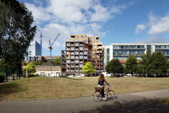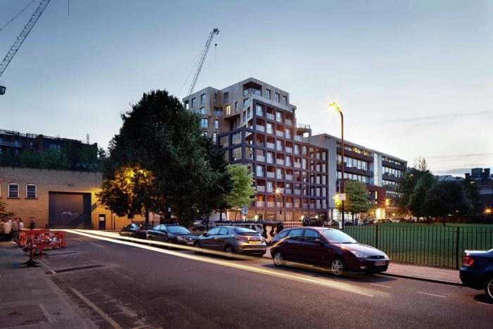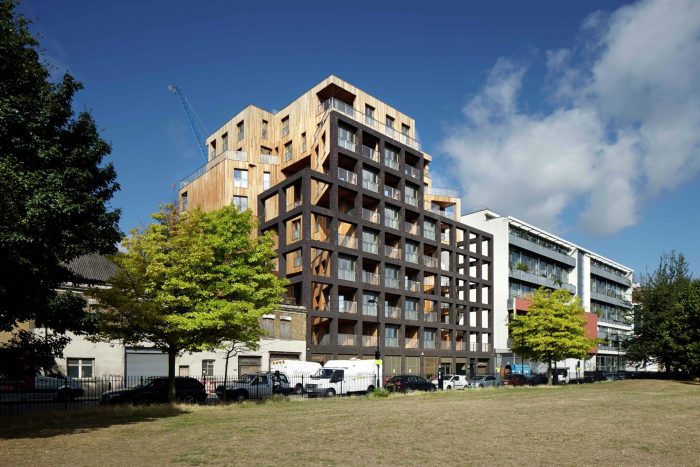 Hawkins\Brown, as commissioned by Regal Homes, has completed 49 new homes on Wenlock Road in Hackney. The £10 million Cube building, located at 17 – 21 Wenlock Road, has a unique timber/steel hybrid structure and is the tallest building to use structural cross-laminated timber in Europe, with its ten stories reaching a total height of 33 metres.