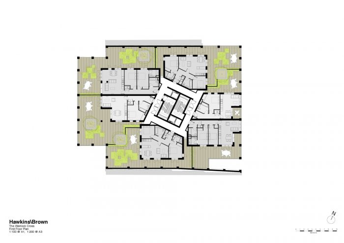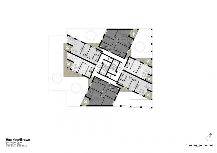 这个6750平方米的方案,Regal Homes在2015年赢得了《伦敦标准晚报》新房奖的杰出建筑成就奖,它的设计采用了扭曲的十字形规划,确保每个公寓都能看到西边邻近的运河流域,或东边的公园。十字形布局颠覆了传统的内向型庭院式建筑,创造了四个朝向周围城市的庭院,创造了视野,改善了拥有三面外墙的公寓的采光和通风。