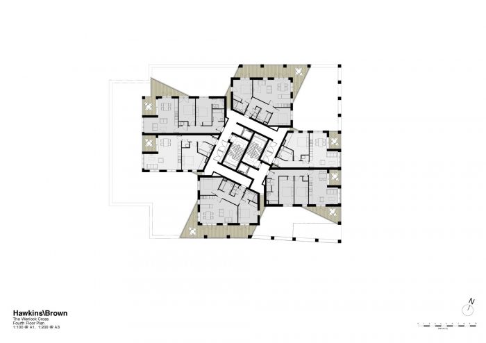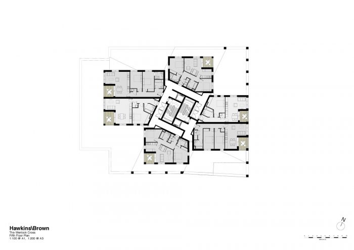 The 6,750 sq m scheme, for which Regal Homes won the London Evening Standard New Homes Award for Developments of Outstanding Architectural Merit in 2015, has been designed with a twisted cruciform plan, ensuring each apartment has views up and down the neighbouring canal basin to the west, or across the park to the east. The cruciform layout turns the traditional inward-looking courtyard block on its head, creating four courtyards that face out towards the surrounding city, creating views and improving access to light and air from apartments that have three external walls.