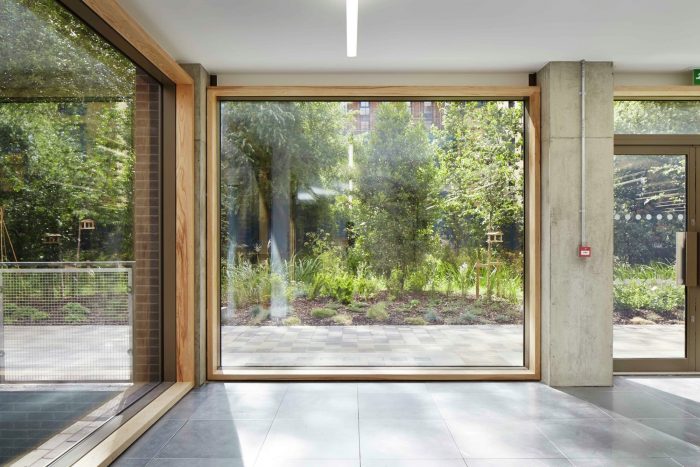 The elevations of the building have been clad in slatted western red cedar. An open screen of black brick creates an orthogonal grid that wraps around the Wenlock Road elevation of the building, creating a visual harmony with the neighbouring buildings appropriate to the nearby conservation area.