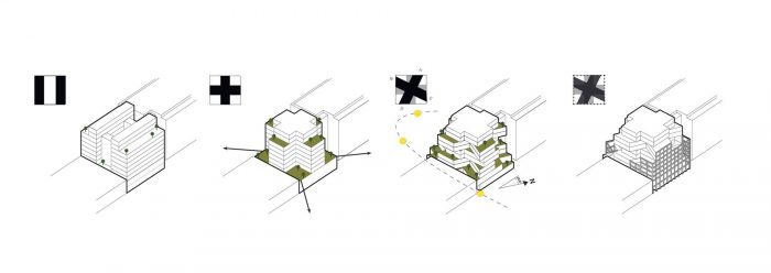 To achieve the unique “twisted stack” layout of The Cube, which has floors that cantilever out from the main mass of the building, Hawkins\Brown worked with specialist contractor B+K Structures to develop a CLT and steel hybrid structure built around a reinforced concrete core.