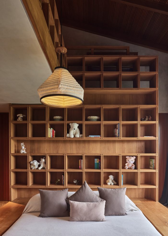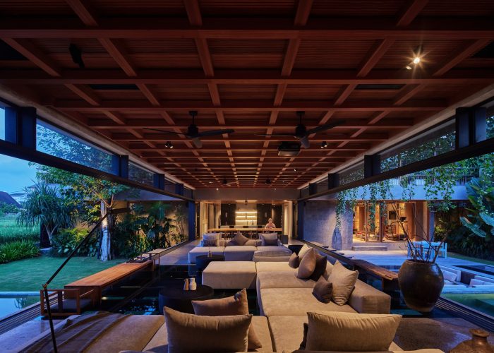 Materials throughout the residence showcase local craftsmanship, featuring paras kerobokan stone walls and wooden ceilings with fluted patterns, paired with a variety of textiles and fabrics that add depth and warmth to the clean architectural lines.