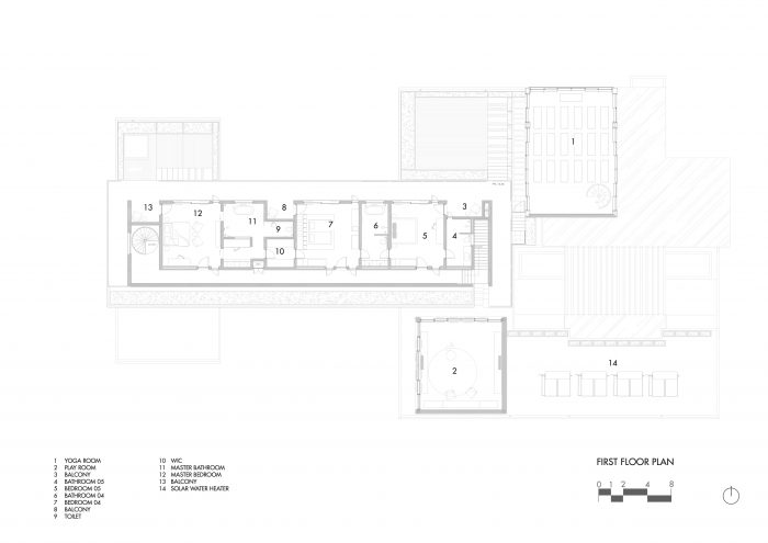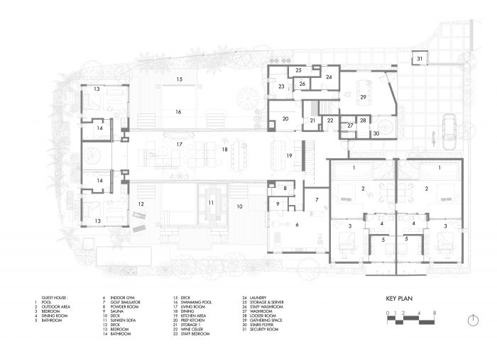 由巴厘岛景观公司设计的热带花园是住宅设计不可或缺的一部分,它营造了一个郁郁葱葱的背景,增强了室内外的生活体验。一楼设有一个健身房和两个客房,所有房间的设计都最大限度地利用了花园的景观和通道。瑜伽区的设计灵感来自隈研吾的 Rumah Kaca,大量使用玻璃,以保持与周围自然环境的联系。