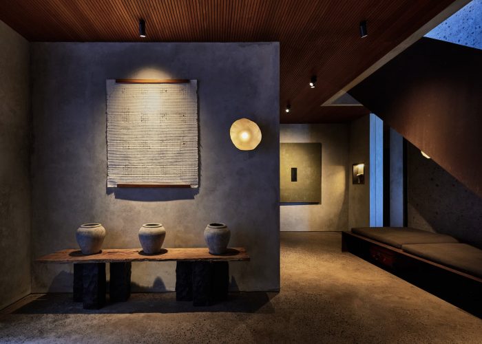 整个住宅的材料都展示了当地的手工艺,墙壁和木质天花板上都有凹槽图案,搭配各种纺织品和织物,为简洁的建筑线条增添了深度和温暖。靠近入口处的一个特色装置是一个巨大的酒柜,它既是一个实用的隔热解决方案,也是一个引人注目的雕塑元素。