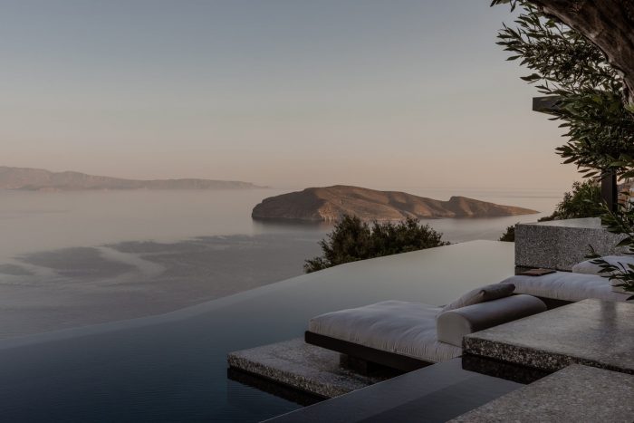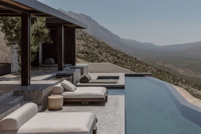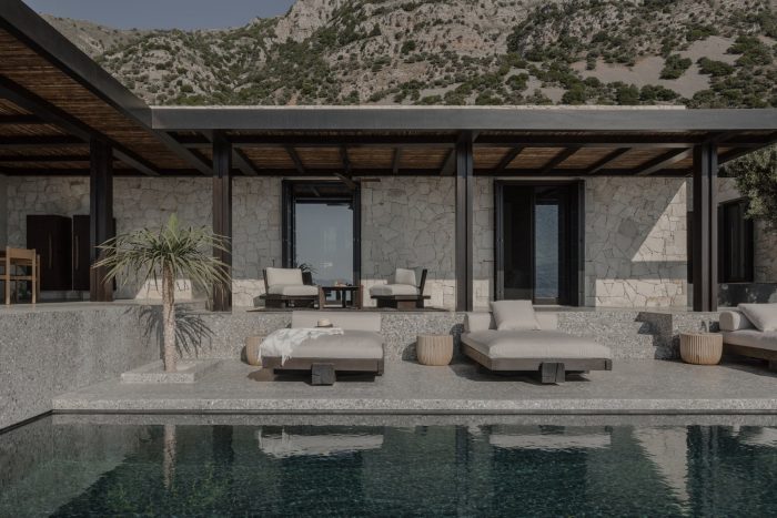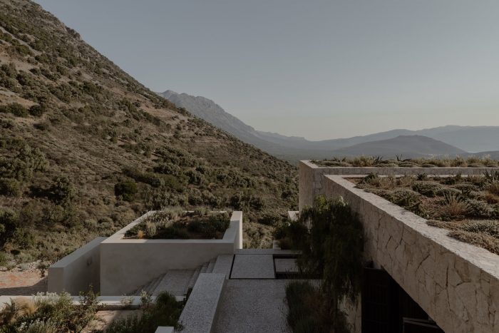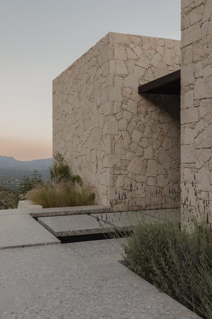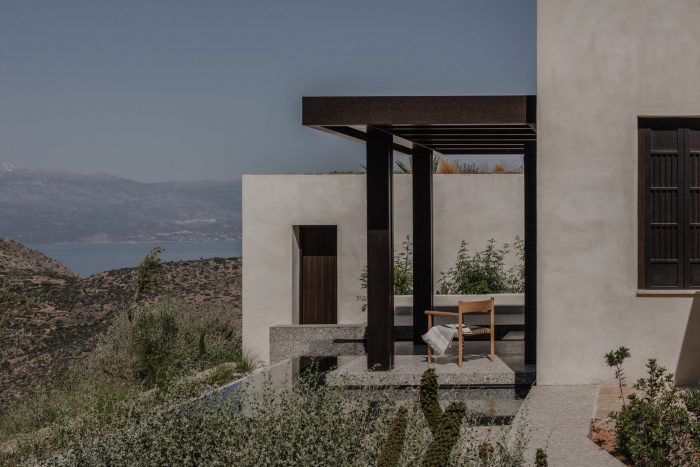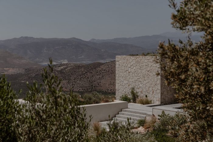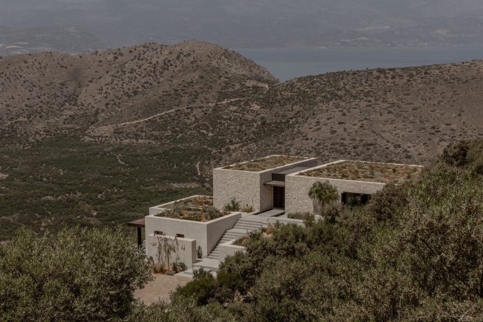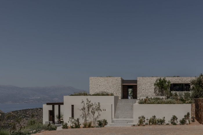 The green, wild Cretan landscape and the richness and heritage of traditional crafts define this new, thoroughly contemporary residential design by Block722. Sat on the northern foothills of Thrypti mountain within the Greek island’s eastern side, the project is a commission by a private client. It called for a 280 sq m home on a slope, including two guestrooms and generous outdoor areas.