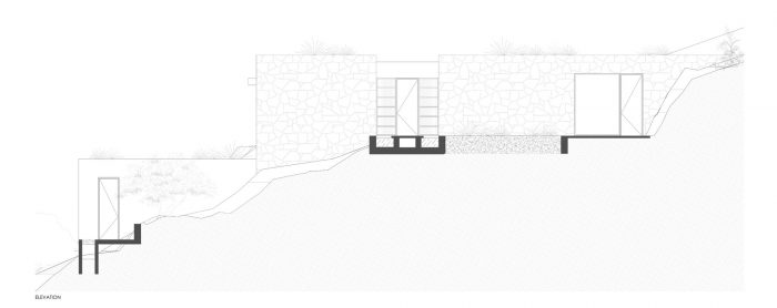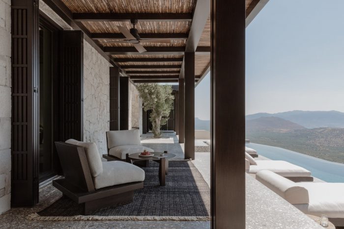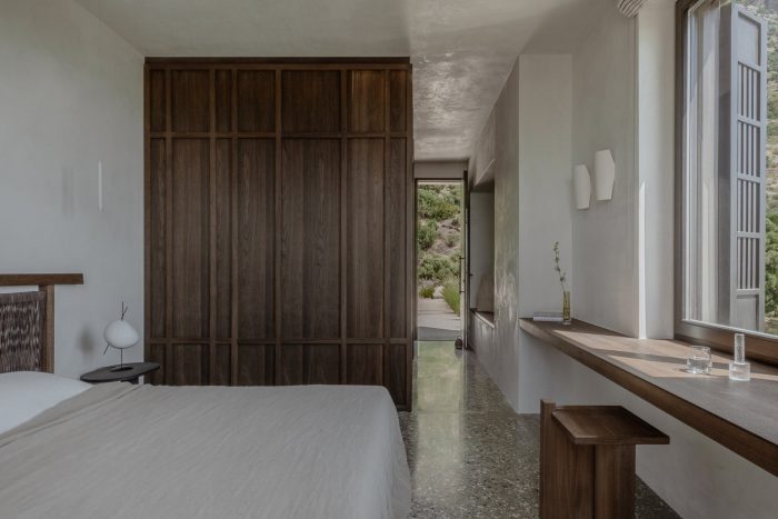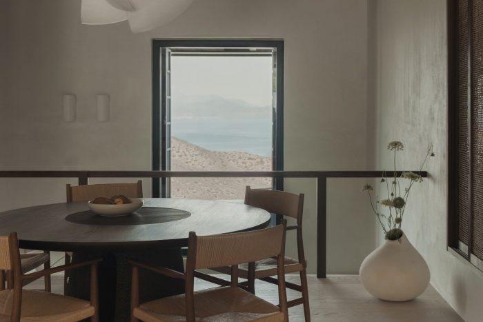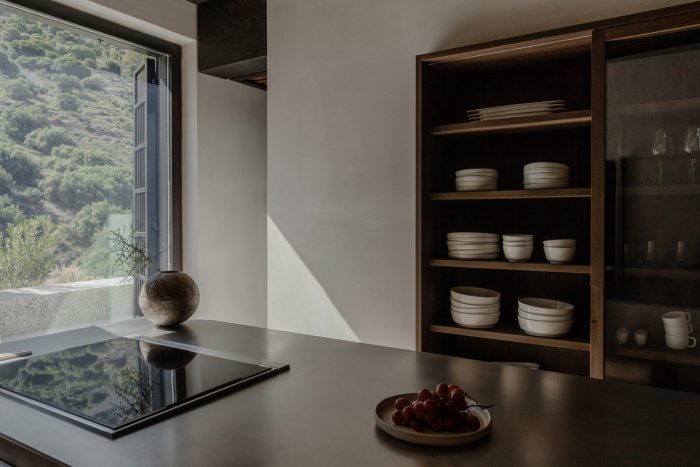 The powerful Greek sunlight helps define shapes and surfaces, playing with the textured materials, as the architects drew on the feel and rhythm of the context for both interiors and exteriors. The journey of light and the clients’ habits throughout the day led to the spatial arrangement inside. Each section and route are carefully planned to support functionality and frame vistas, through visual journeys and spatial narratives that blend inside and outside, the natural and the human-made. The design seeks to enhance slow living, taking its cues from the island’s lifestyle.