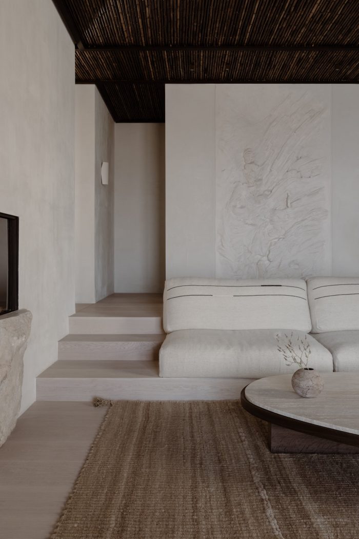 强大的希腊阳光有助于定义形状和表面,与有质感的材料一起玩耍,因为建筑师在室内和室外都借鉴了环境的感觉和节奏。光线的旅程和客户一天的习惯导致了内部的空间安排。每一个部分和路线都经过精心规划,以支持功能和框架远景,通过视觉旅程和空间叙事,将内部和外部、自然和人为融合起来。该设计旨在加强慢生活,从岛上的生活方式中汲取灵感。