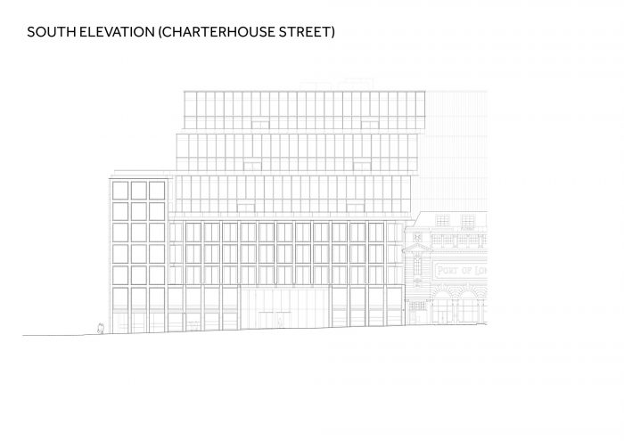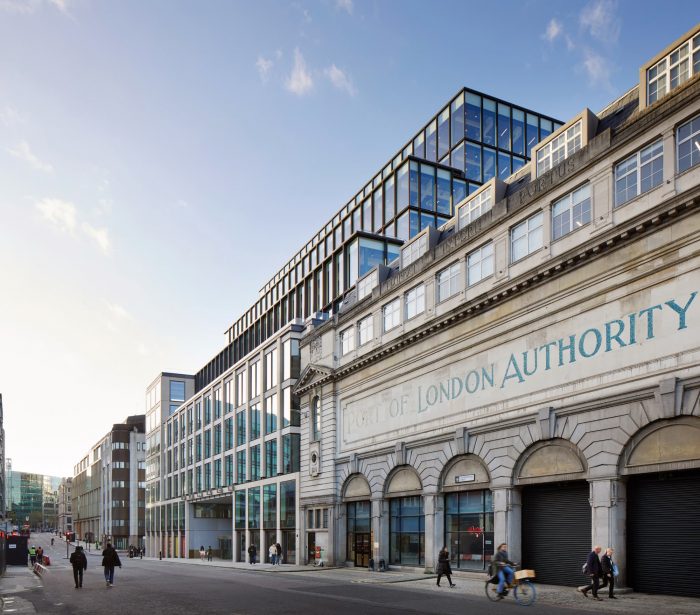 The façade on Charterhouse Street responds to the smaller scale of the listed Port of London Authority building next door. An impressive south-facing, double-height lobby welcomes employees and visitors. Beautiful stone floor tiles with bronze detailing, English reclaimed timber and a striking bronze reception desk greet you on arrival. Along the east façade is an atrium with a full-height artwork from the ground to the fifth floor, enclosed by (fire-rated) glazing. This presents a striking, light-filled perimeter to the lower floors of the building.