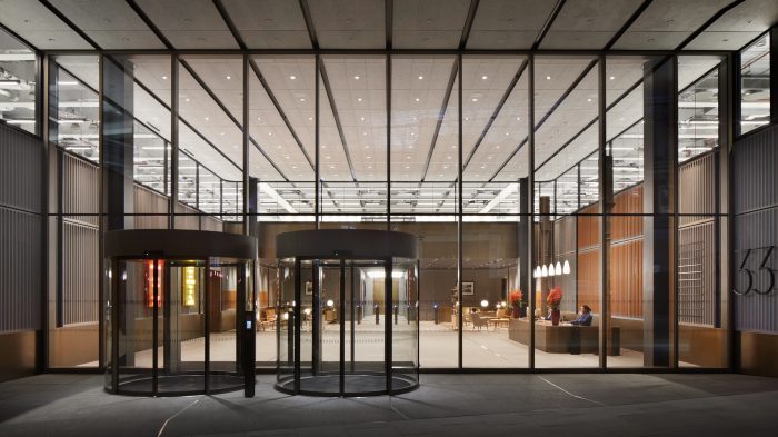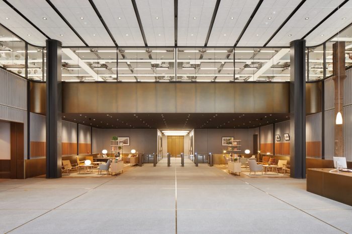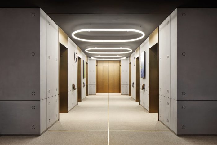 查特豪斯街的外墙与隔壁的伦敦港务局的小规模建筑相呼应。一个令人印象深刻的朝南的双高大厅欢迎员工和访客。美丽的石头地砖与青铜细节,英国再生木材和醒目的青铜接待台迎接您的到来。沿着东面的立面是一个中庭,从地面到五楼都有一个全高的艺术品,由(防火)玻璃封闭。这为建筑的低层提供了一个引人注目的、充满光线的周边环境。